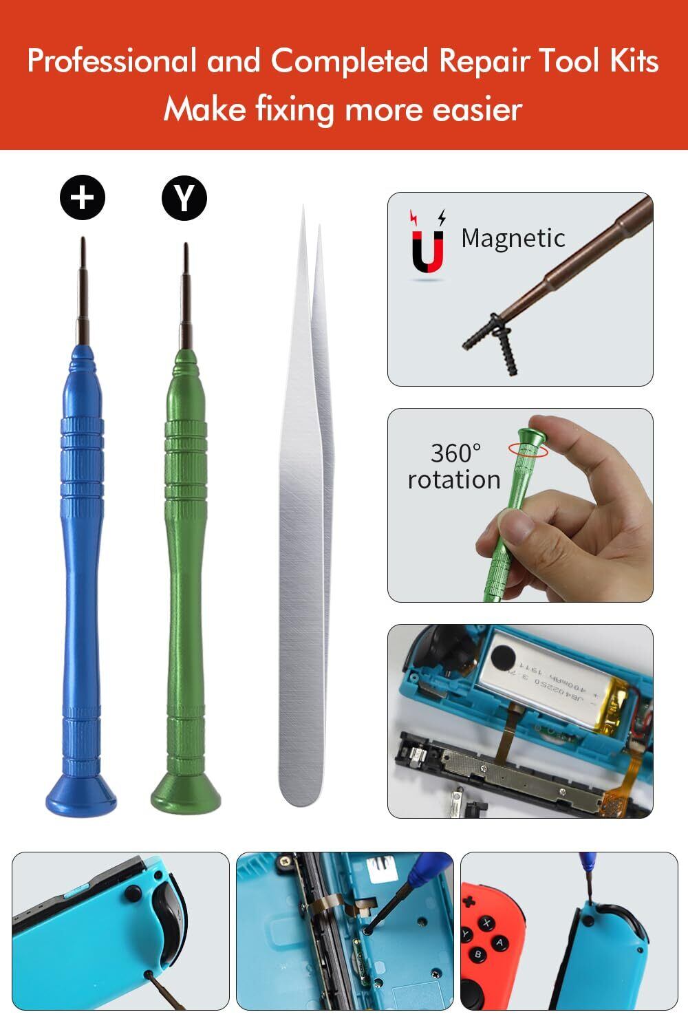 【改良されたドライバー・耐久性優れた】Yネジとは、ニンテンドースイッチのコントローラを分解する際に、一番最初に取り外す4本のネジのことです、「Y型」の溝になっています。それに、内部のネジを取り外すために、+型のドライバーが必要です。ドライバーの先端に磁気が搭載されますので、Joyconのネジを外す際に使用する時、バッチヘッド磁気でネジを落とさなくない超楽です。予備のネジ6pcsが付属し、ネジが壊れたり、紛失したりする時、予備のネジを交換できます。また、市場のプラスチック製のドライバーの代わりにアルミ合金を使用して、耐久性や耐磨耗性に優れています。
