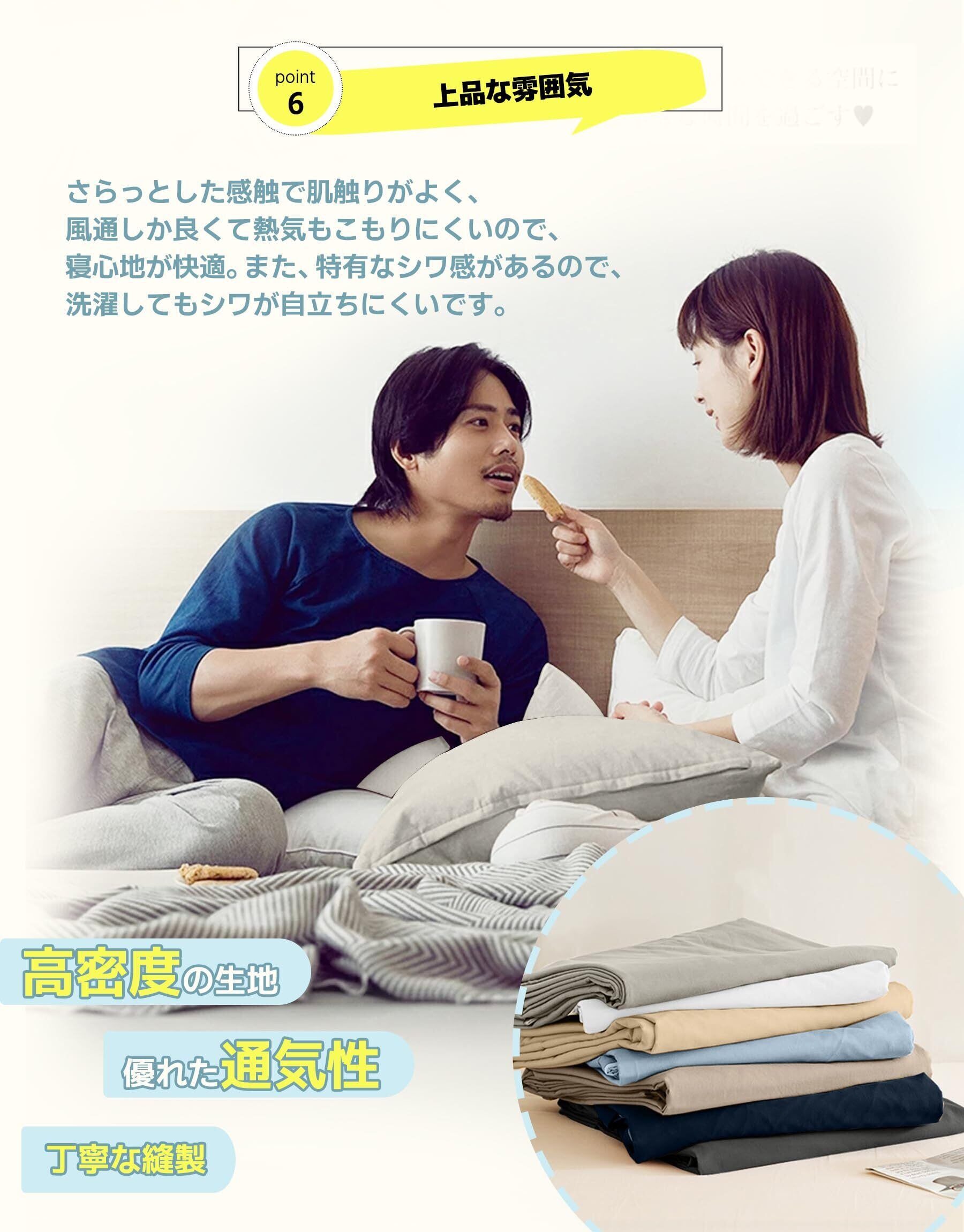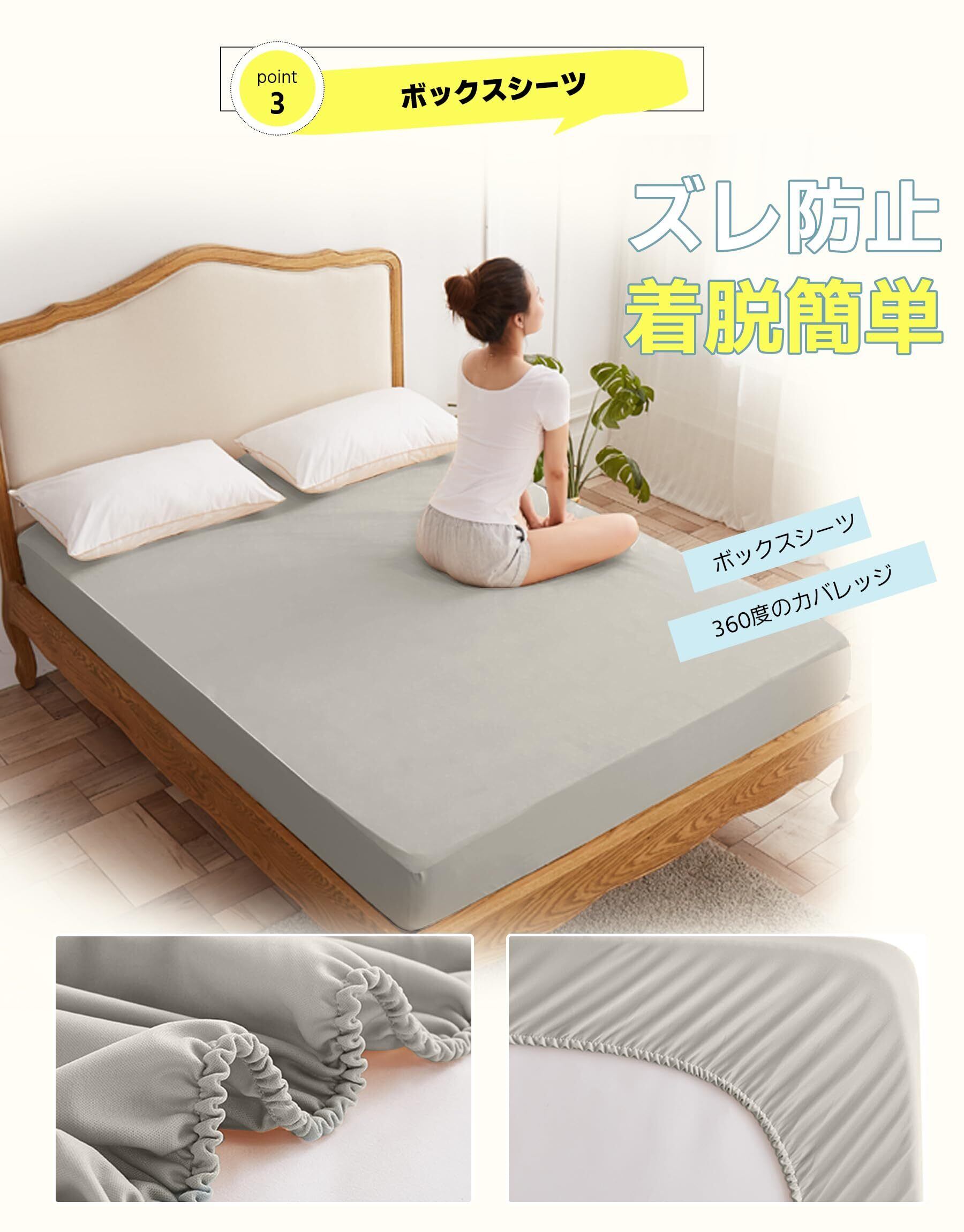 【セット内容・仕様】「掛け布団カバー・150x210cm(1枚)」:片側にファスナーを使用、布団留め紐8ヶ所付き。「ボックスシーツ・100X200+30cm(1枚)」:全周ズレ防止ゴム付き、高さ3-28cmの敷き布団とマットレスの底まで包むことが可能。「枕カバー・43X63cm(1枚)」:封筒式で出し入れが簡単です。