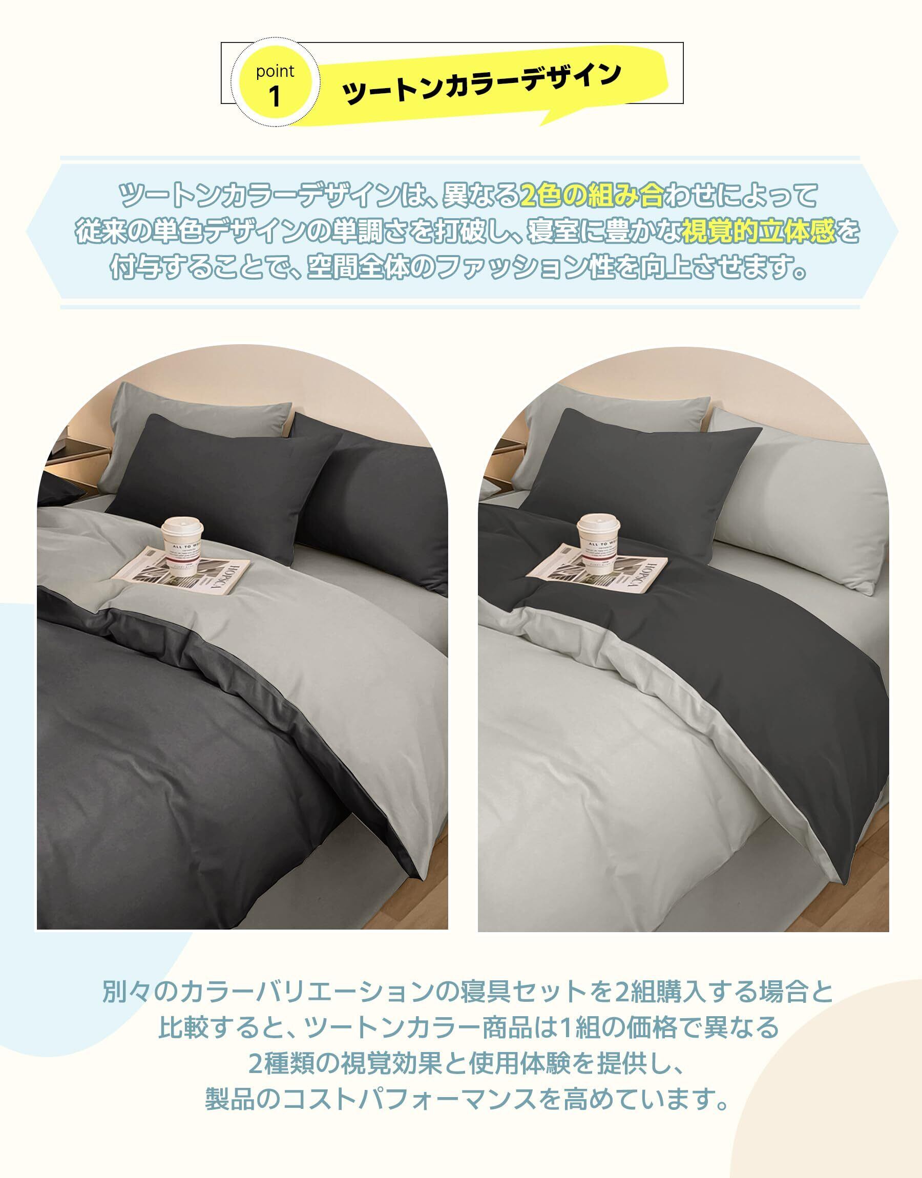 【デザイン性抜群 ツートンカラーデザイン】掛け布団カバー・ボックスシーツ・枕カバーに洗練された2色配色を採用。色の境界線に精密なステッチ加工を施し、洗濯でも色落ち・色混ざりせずデザインを維持。従来の単色デザインを進化させ、お部屋のインテリアに立体感とモダンなアクセントを添えます。