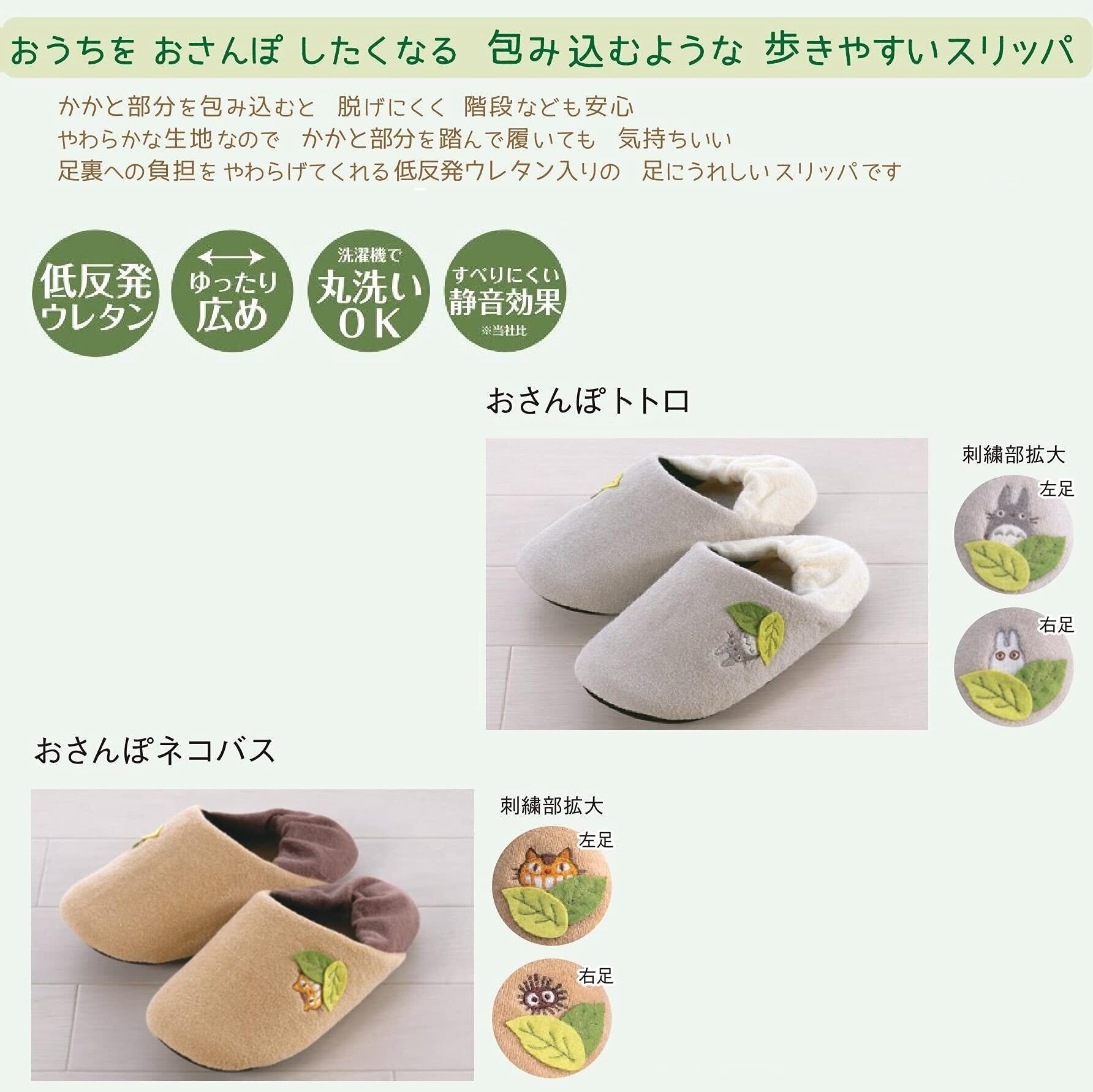 おうちをおさんぽしたくなる、キャラクターの刺繍が入った歩きやすいスリッパ。左右のあるフィット形状(右:小トトロ/左:大トトロ)、やわらか生地で包み込むような履き心地。かかとを包んだり踏んでも履けるバブーシュタイプ。中板部分はワイドでゆったり広め、内部に低反発ウレタン入り。ウォッシャブル(タンブラー乾燥はできません)。