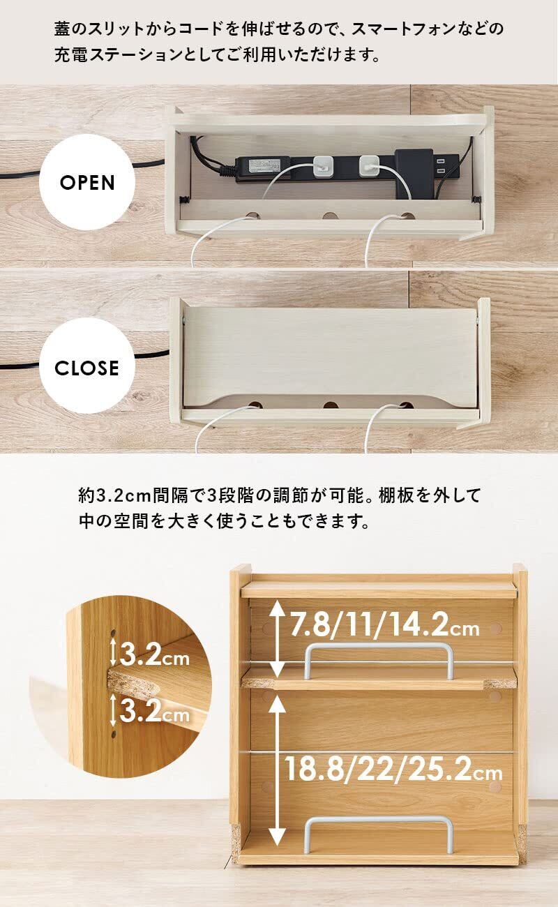 Wi-Fiルーター・モデムや配線の収納、ホコリ予防、小さなお子様やペットのトラブル防止としてはもちろん、天板に小物も置けるのでサイドテーブルや充電ステーションとしても使えます。