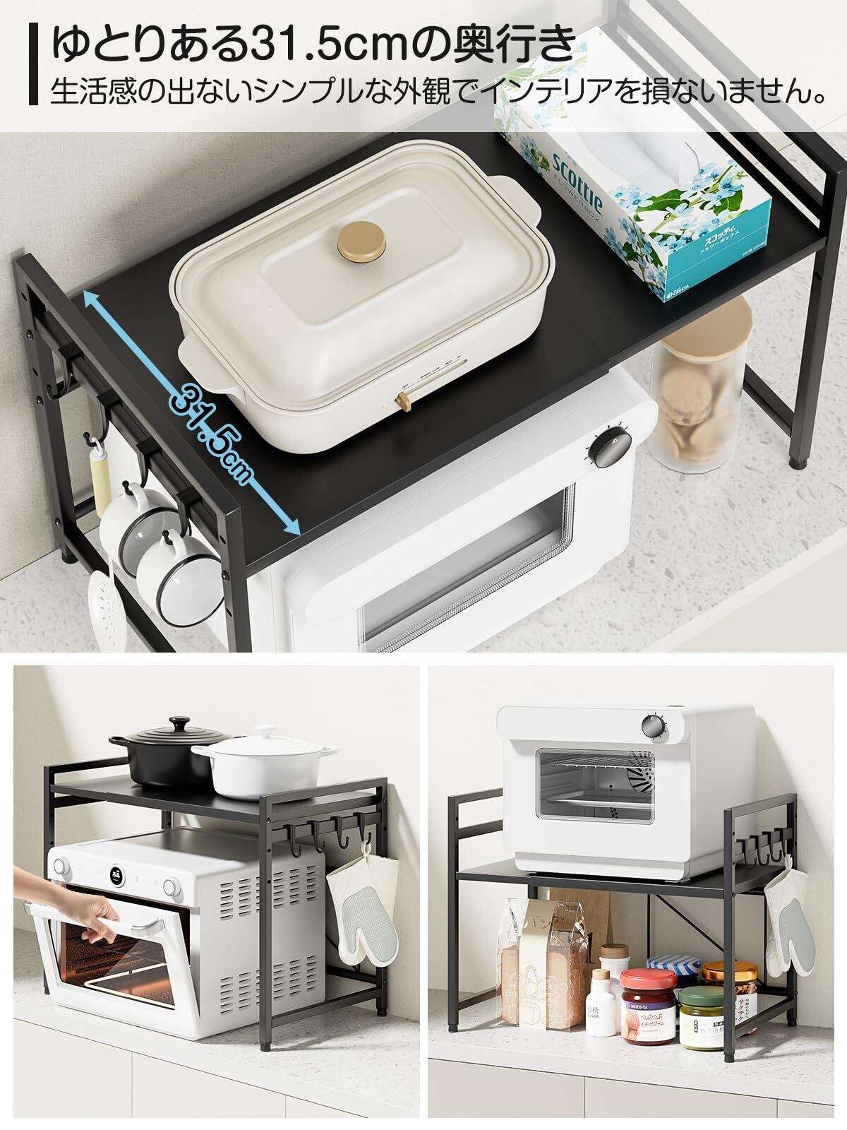 電子レンジ上のデッドスペースを有効活用できる伸縮キッチンラック:レンジ上ラックは、約幅36cm~65 cm(内寸)で無段階調整できる、可動棚板は約5.5cm間隔で3段階で高さ調節可能です。レンジの大きさや収納物の量、置く場所の広さなどに合わせたご家庭のキッチンにちょうどいい形で設置していただけます。サイドバーを4個s字フックなどを使用した吊り下げ収納に使えます。レンジラックとして使えるし、洗面台の下の棚としても使える、リビングでも使えます。オーブンレンジラックは黒と白、2カラーがあります。