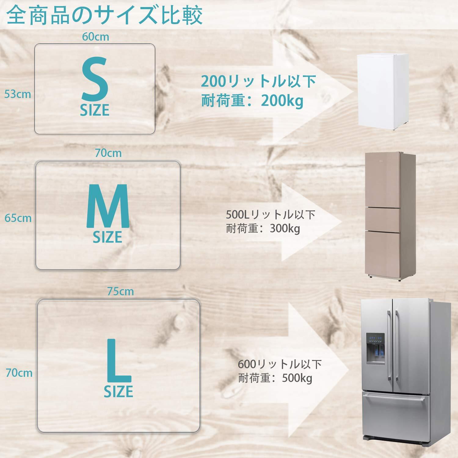 キズ/凹みを防止:ソフトの素材なので、床に受けた圧力が大幅に激減する。冷蔵庫を置く際に緩衝材のように床やフローリングから傷や凹みからきちんと守ります!三サイズを選択可能、Sサイズ(53*62cm)、耐荷重:200kg、200Lクラスの冷蔵庫適用;Mサイズ(65*70CM)、耐荷重:300kg、500Lクラスの冷蔵庫適用;Lサイズ(70*75CM)、耐荷重:500kg、600Lクラスの冷蔵庫適用。