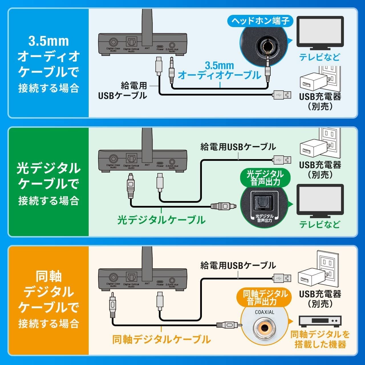 サンワダイレクト Bluetoothトランスミッター テレビ用 2台同時にapt-X LL接続 USB給電 光デジタル 3.5mm 同軸デジタル 400-BTAD011
