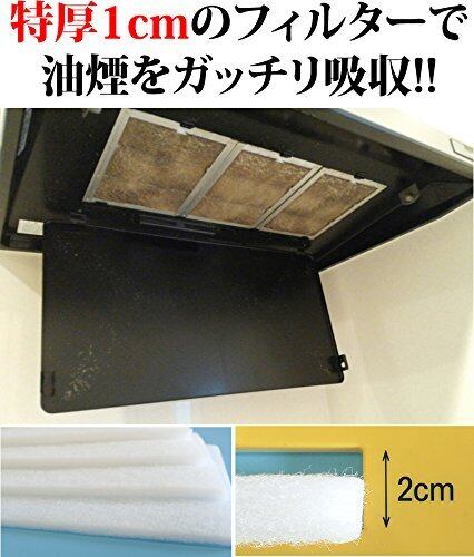 特厚1cmだからお料理中に発生する油煙の油だけを吸収し綺麗になった空気だけをレンジフード内やダクトに通すのでフード内からダクトが劇的に汚れなくなり換気扇そうじを大幅に省くことができます。フィルターには難燃性不織布を使用し自己消火機能までもたせた日本製の高品質な換気扇フィルターです。破片を吸うリスクを回避するためにあえてガラス繊維は使用せずポリエステル100%でも炎が上がらない特殊な製法で成型しています。消防法施行規則第四条に則り防炎性能を確認済です。フィルター販売25年の高品質な使い捨て換気扇フィルターです。