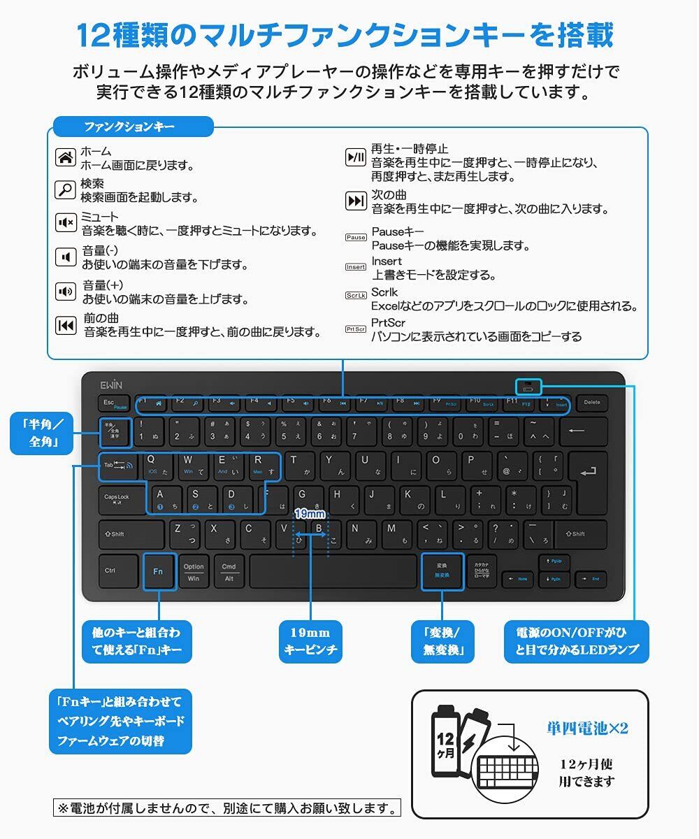 Ewin 「スタンド付き」 日本語配列 bluetooth キーボード マルチペアリング アイ パッド タブレット用キーボード ipad ダブレット スマホ ノートPC パソコン mac android ios Windows対応 (ブラック)