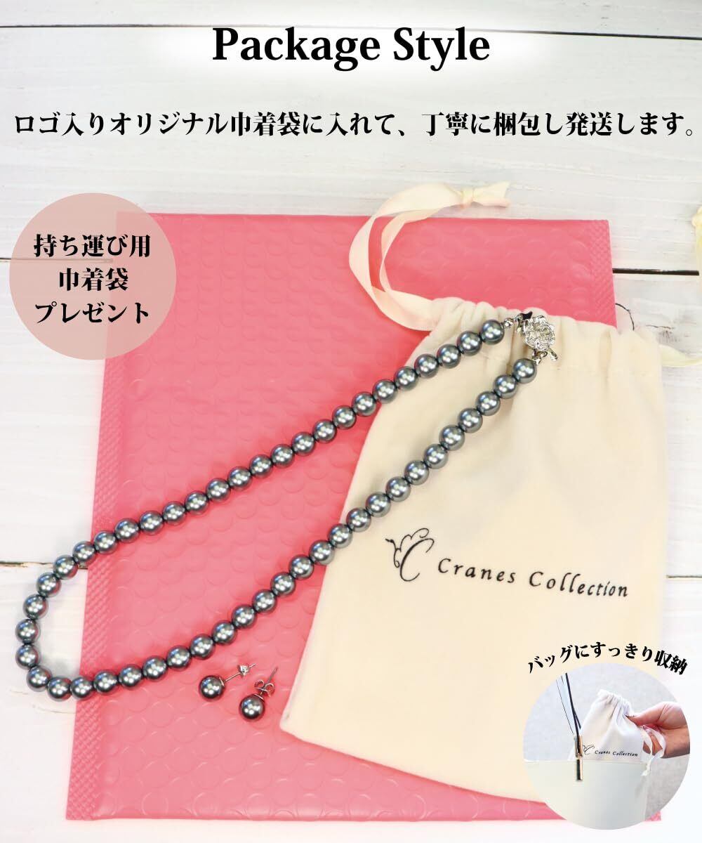 [CRANES COLLECTION] パール ネックレス ピアスイヤリング 2点 セット 日本製 グレー 国産真珠 自社生産 8mm珠 冠婚葬祭 巾着袋付 選べる6サイズ (シルバーブラックカラー)