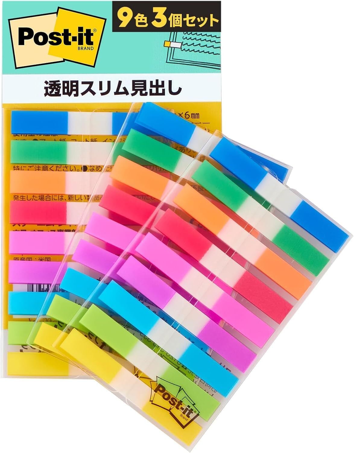・じょうぶで破れにくい、フィルム素材のポストイット製品。・貼ると透明になり、下の文字や絵などを隠しません。・1枚ずつ取り出せるポップアップ式です。・本や書類で、ページの細かい分類や数多くの見出しが必要な時に色数が多く、色分けに便利。・フィルム素材なので長期間でもキレイに保管できる。また、はがしたい時にキレイにはがせる。くり返し貼ったりはがしたりでき、破れにくい。