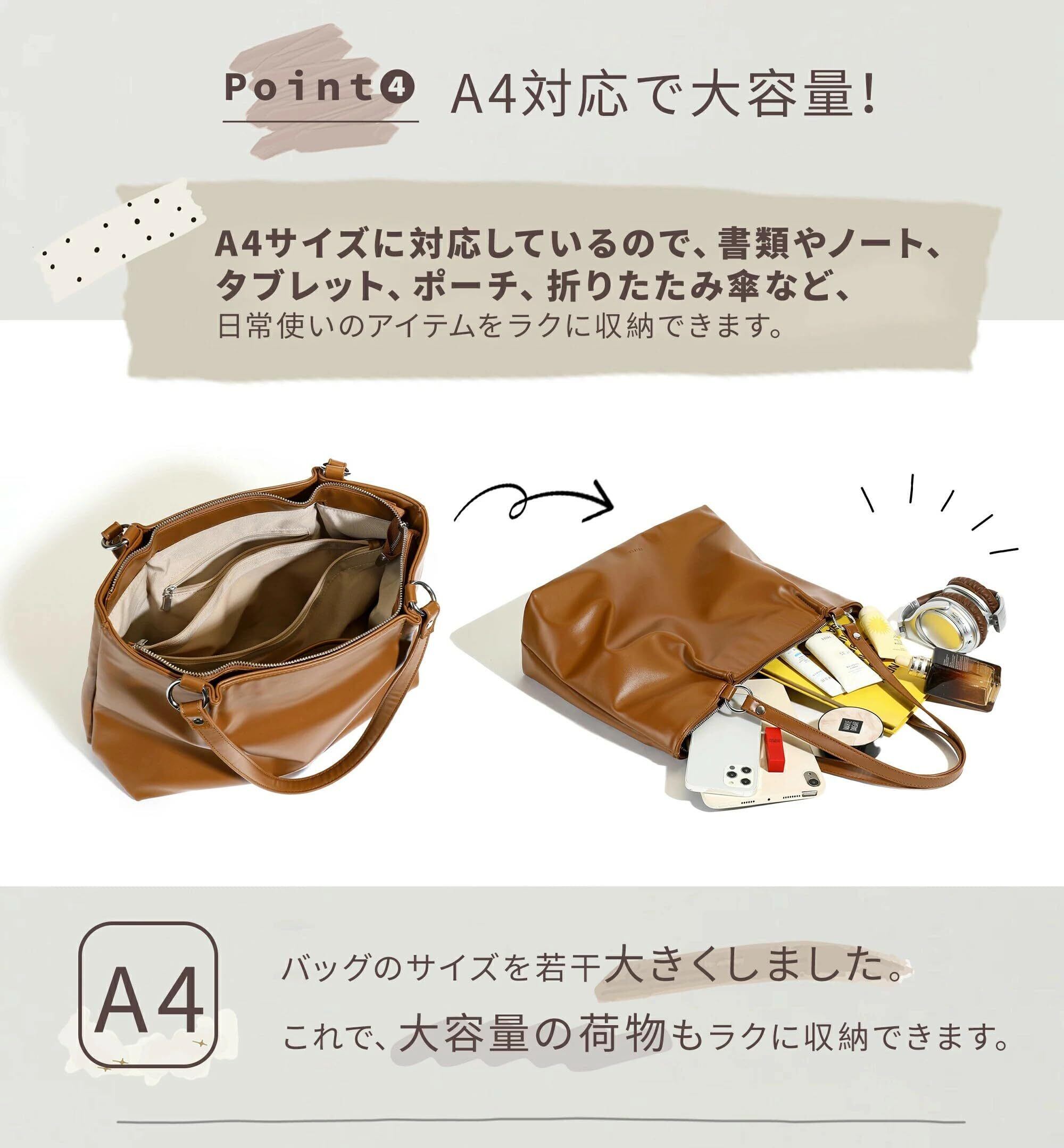 【A4対応&大容量で実用的!】ノートや書類、タブレット、ポーチ、折りたたみ傘などをすっきり収納できる大容量のレディースビジネスバッグ。通勤バッグとしてはもちろん、通学や出張にも対応できる実用性が魅力です。軽量設計で肩掛けしても負担が少なく、長時間の持ち歩きにも快適。シンプルかつ上品なデザインで、ビジネスシーンから日常使いまで幅広く活躍します。かばんを肩掛けスタイルでスマートに持ちたい方にもぴったりの一品です。収納力と機能性を兼ね備えた、働く女性のためのレディースビジネスバッグ大容量・軽量モデルです。