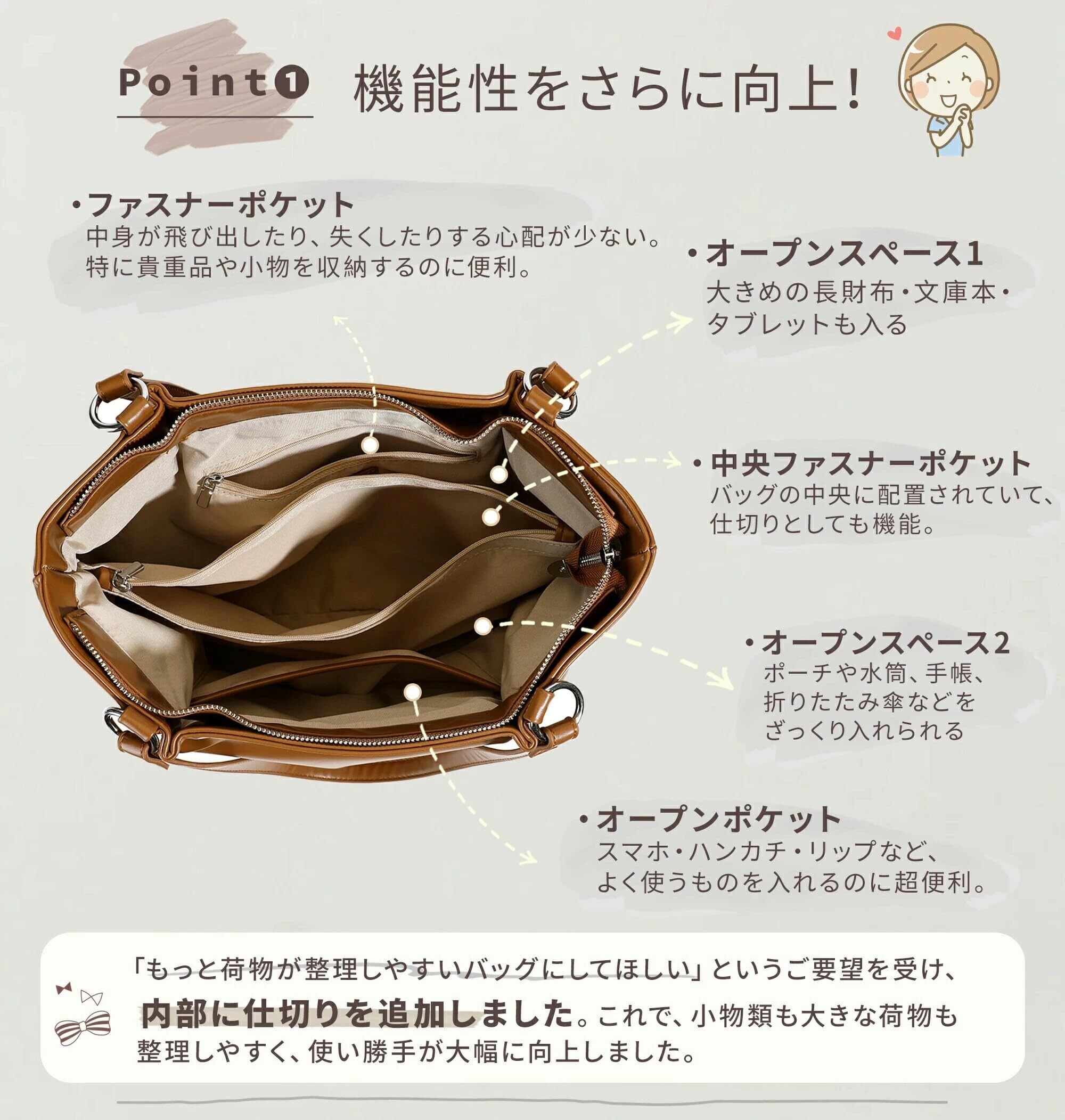 【収納ポケットを増設し、整理上手に】内外に多数のポケットを備えて 、小物の整理が簡単。スマホ、鍵、パスケース、コスメなどを用途別に分けて収納できるため、バッグの中がいつもすっきり。機能性に優れた設計ながら、軽量なレディースビジネスバッグとしても人気です。