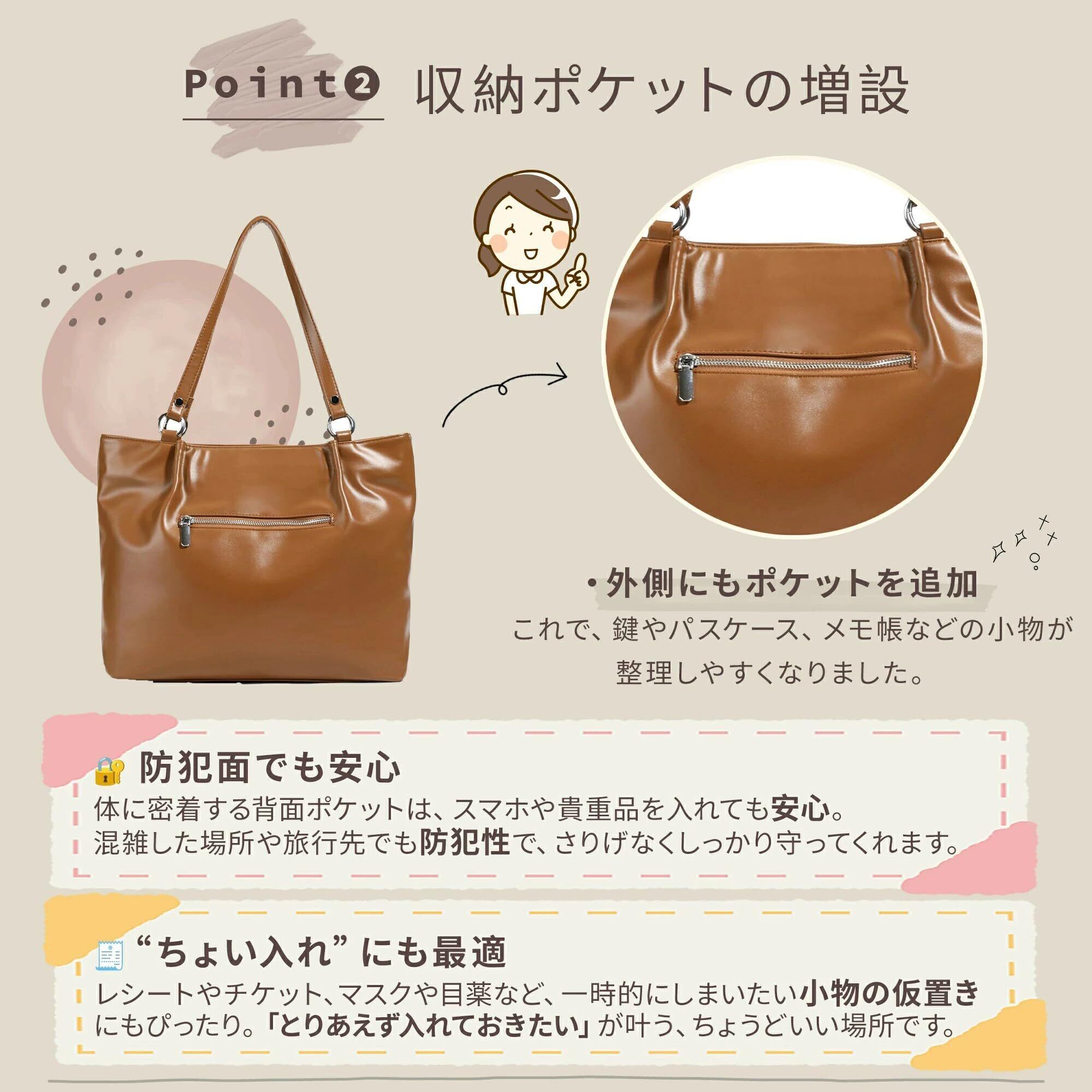 【機能性をさらに向上!】必要なアイテムを効率的に収納できる大容量仕様で、荷物が多い日でも安心です。通勤や出張の女性に最適で、通勤バッグとしても活躍します。洗練された外観はスーツスタイルにも自然にマッチ。軽量かつ機能的な設計で、オンオフ問わず頼れる存在です。日常使いにも馴染みやすく、かばん肩掛けレディースとしても快適にご使用いただけます。収納力と実用性を兼ね備えたビジネスバッグレディース大容量をお探しの方に、ぜひおすすめしたい一品です。