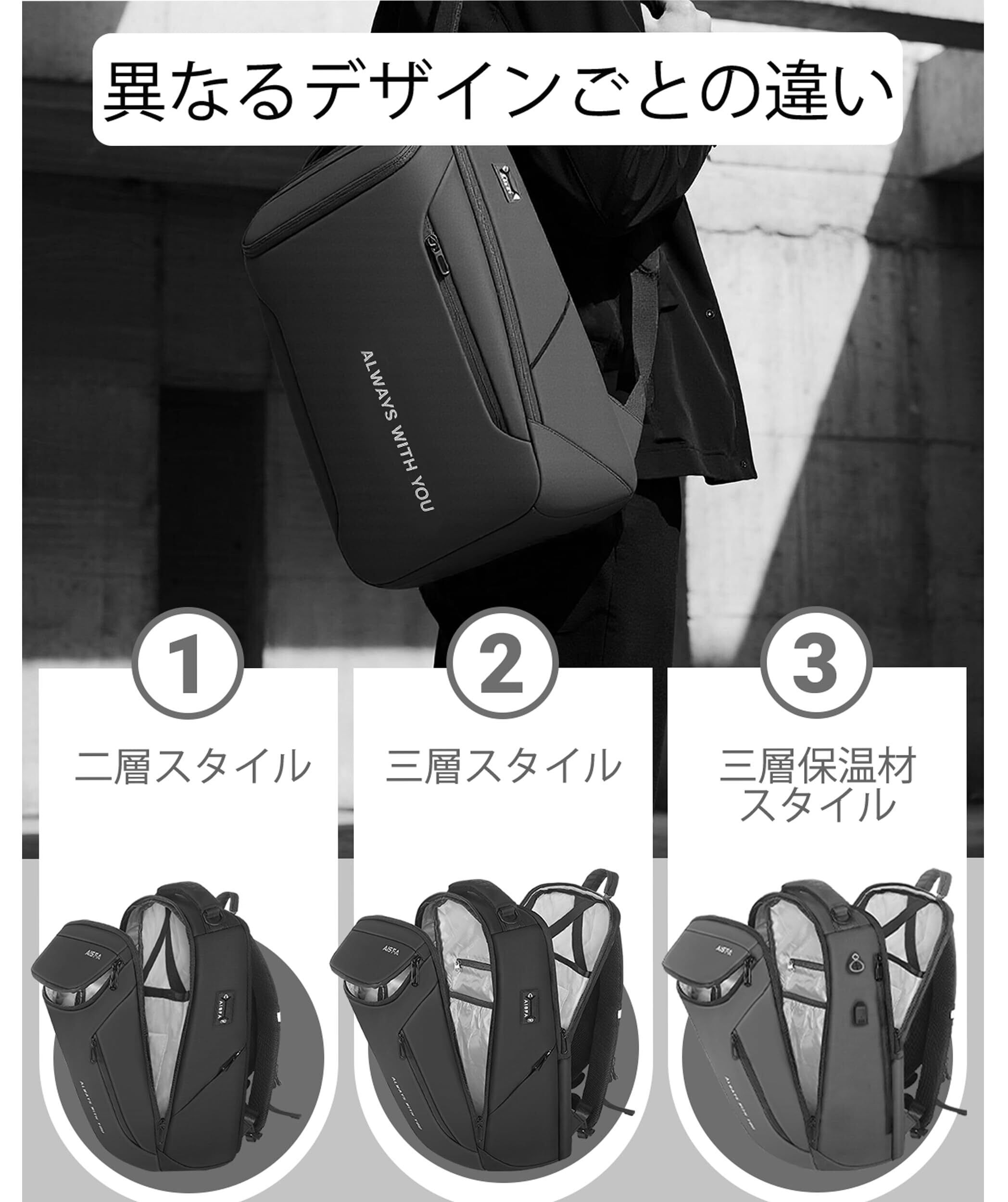 【多機能リュックサック】保温機能:保温ポケットを増設しました。保温だけでなく保冷効果もあります。180°開閉:メインポケットはスーツケースのように約180°大きく開くことができるので、スムーズに出し入れます。反射テープ:反射テープ付きのため、夜間・暗がり・雨天時に車や歩行者からの視認性を大幅に向上させます。キーホルダー:フロントポッケトには着脱式キーホルダー付き、鍵を探す手間が省けます。USB充電可能:側面にはUSBケーブルとイヤホン穴があり、背負ったまま充電可能です。