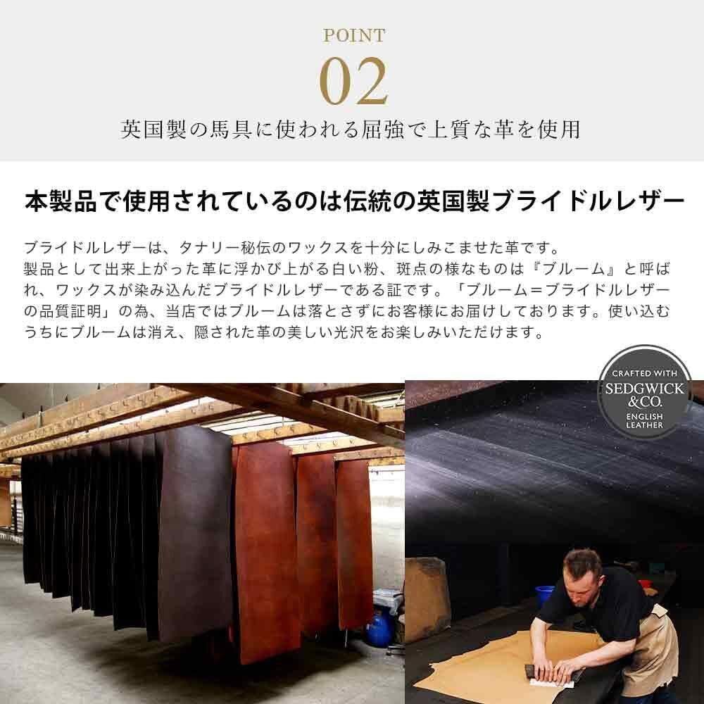 【英国名門タナリーのブライドルレザー】表革にはSEDGWICK社のブライドルレザーを使用。 強度、耐久性にすぐれ、経年変化による革の変化を楽しみながら永くお使いいただけます。