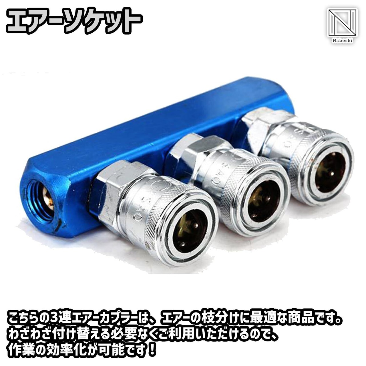 【エアーソケット】こちらの3連エアーカプラーは、エアーの枝分けに最適な商品です。わざわざ付け替える必要なくご利用いただけるので、作業の効率化が可能です!