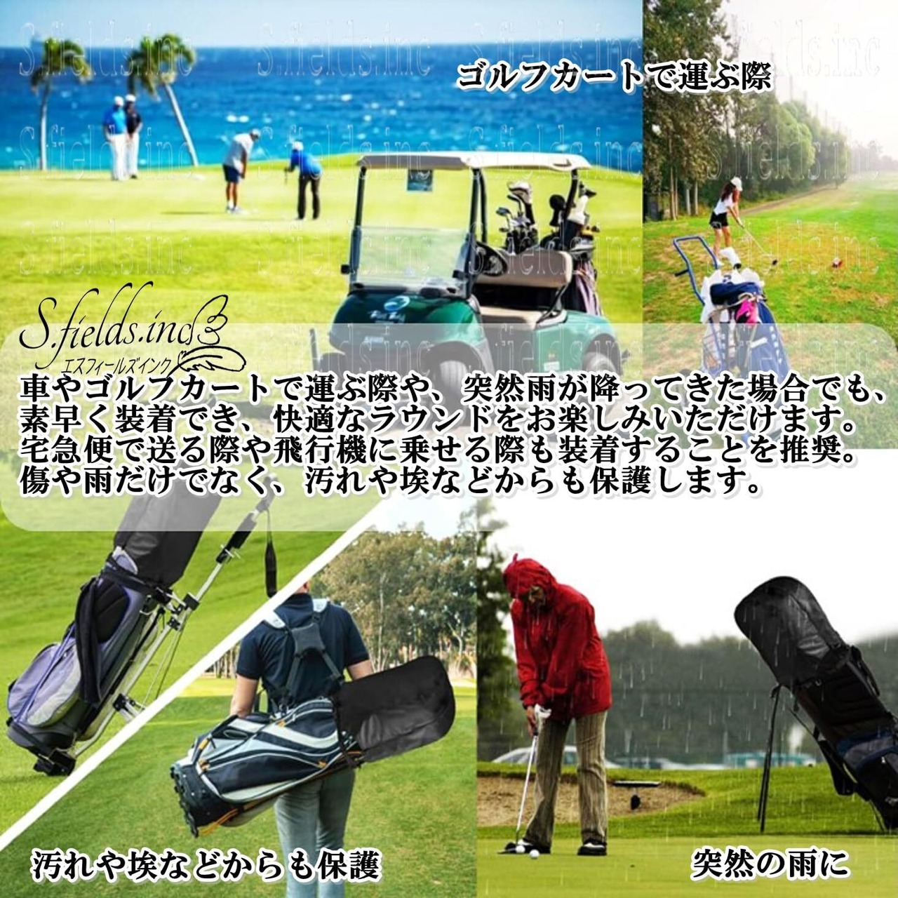 車やゴルフカートで運ぶ際や、突然雨が降ってきた場合でも、素早く装着でき、快適なラウンドをお楽しみいただけます。宅急便で送る際や飛行機に乗せる際も装着することを推奨。傷や雨だけでなく、汚れや埃などからも保護します。