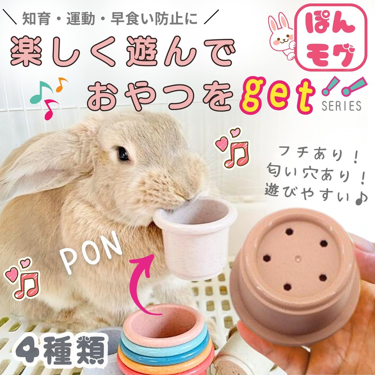 【楽しく遊んでおやつをGET!】カップの中におやつを入れて、兎さんが咥えてカップを外すことで大好きなおやつを見つけることができます。遊ぶ楽しさ、見つける喜び、ぽんぽんモグモグと、とても可愛いです