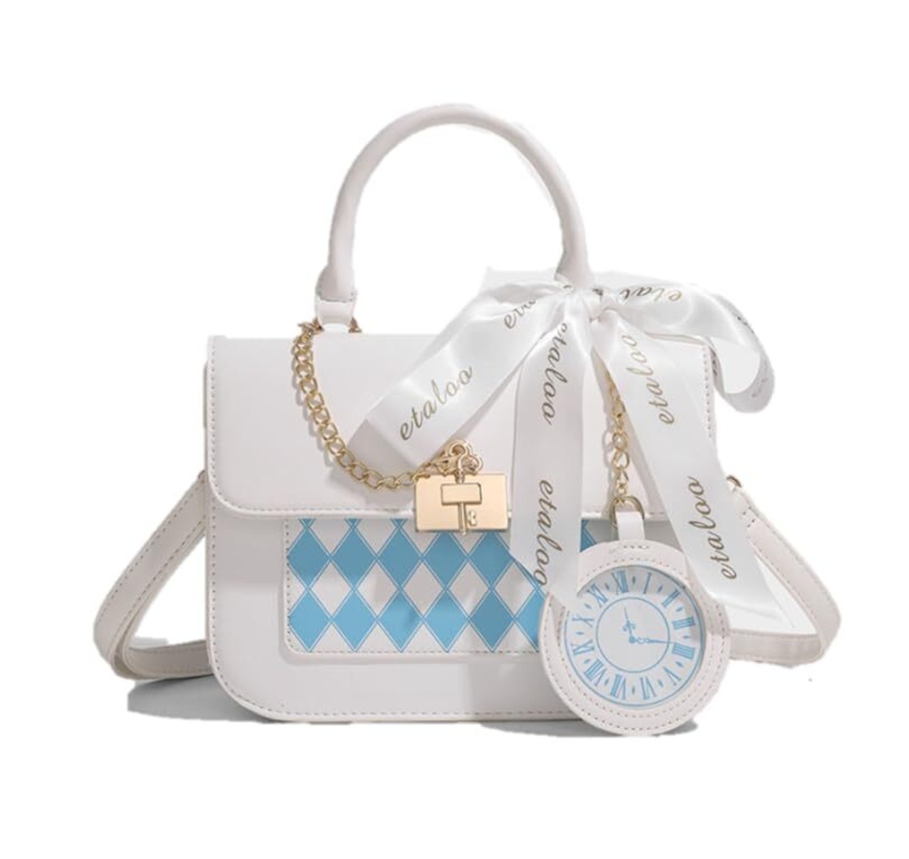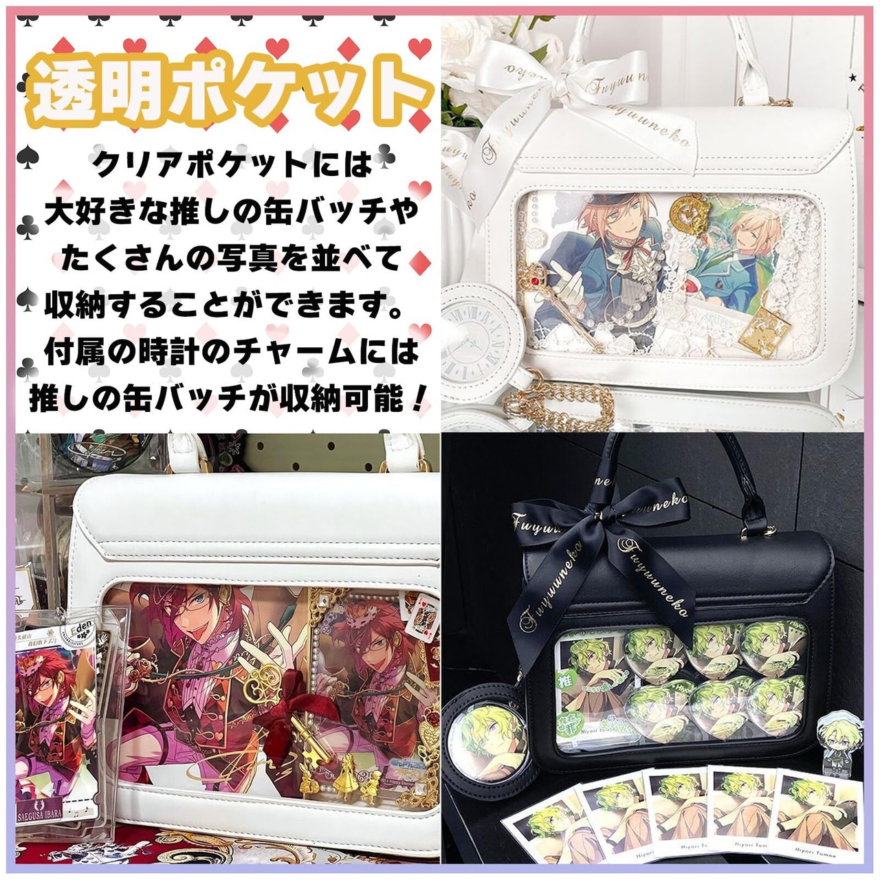 ダイヤ柄のデザインと鍵をモチーフにしたデザインがとても可愛らしくアンティークなデザインとなります。時計風のキーホルダーも付属していて、おとぎの国の世界観をこのミニバッグ全てに詰め込んだ夢のようなデザインのバッグです。背面はクリアポケット仕様になっており、好きな芸能人やアニメのグッズや写真、缶バッジ、ぬいぐるみなどを入れて、自分だけのオリジナルバッグを作ることができますアレンジしたい放題なので世界に一つだけのバッグを作ることができます。クリア部分を裏にしたら痛バッグ感がゼロなおしゃれなバッグに大変身なので2wayとして、通勤や通学、プライベートでも使用できるのでお仕事終わりに推し活バッグを使いたい時に、とても便利なアイテムです