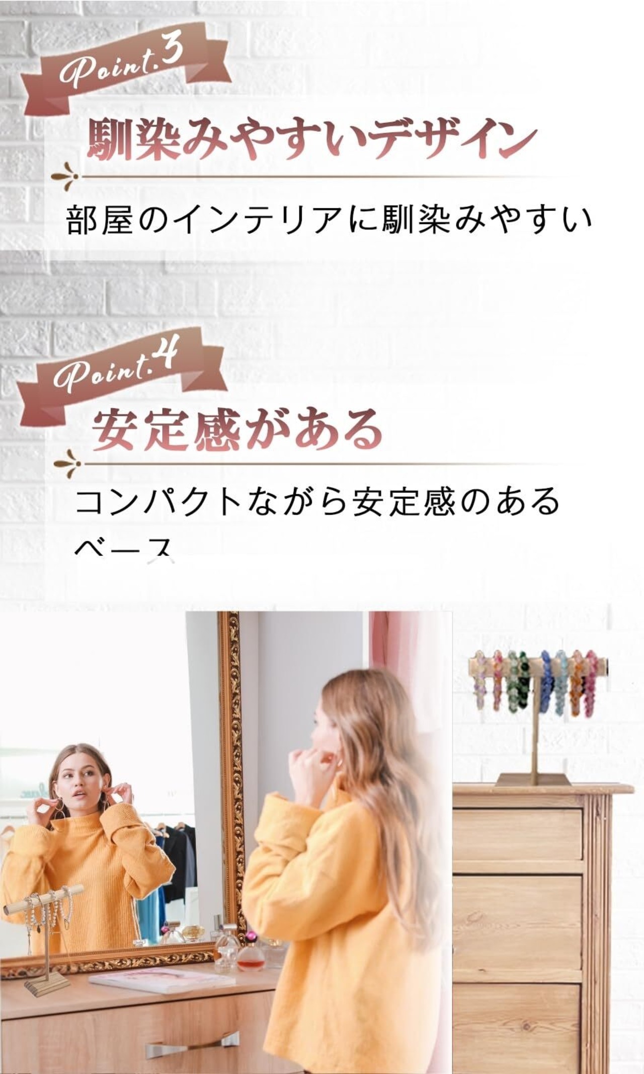 【シンプルなデザイン】リビングやベッドルームなど、どんなインテリアにも馴染むデザインで、アクセサリーの美しさを引き立てます。シンプルな構造が整理の手軽さと見やすさをもたらし使いやすいです。