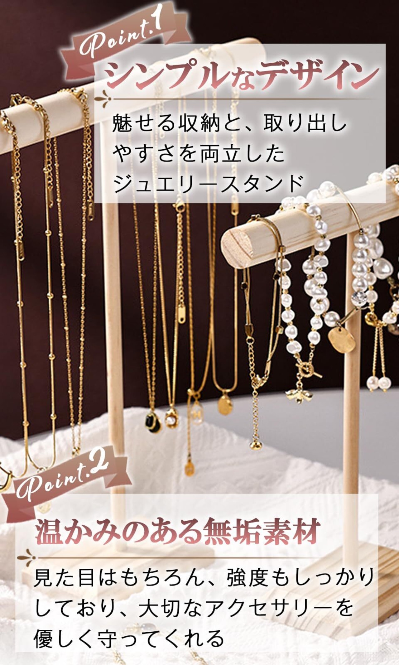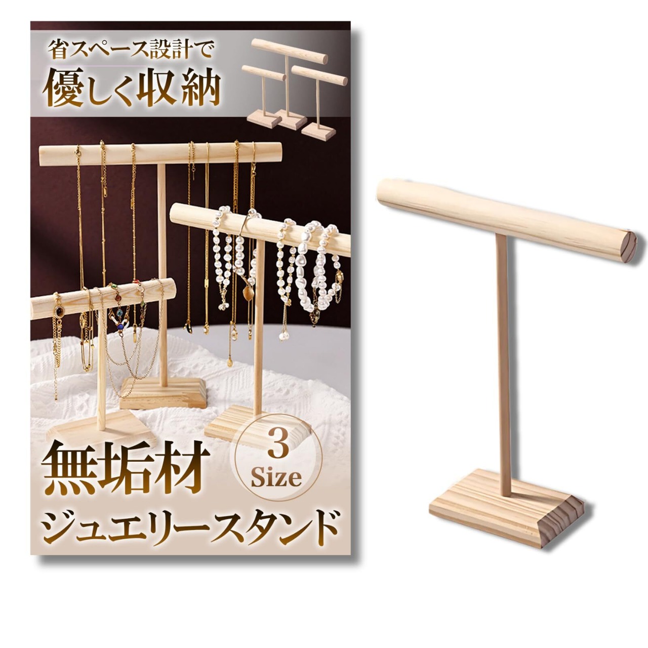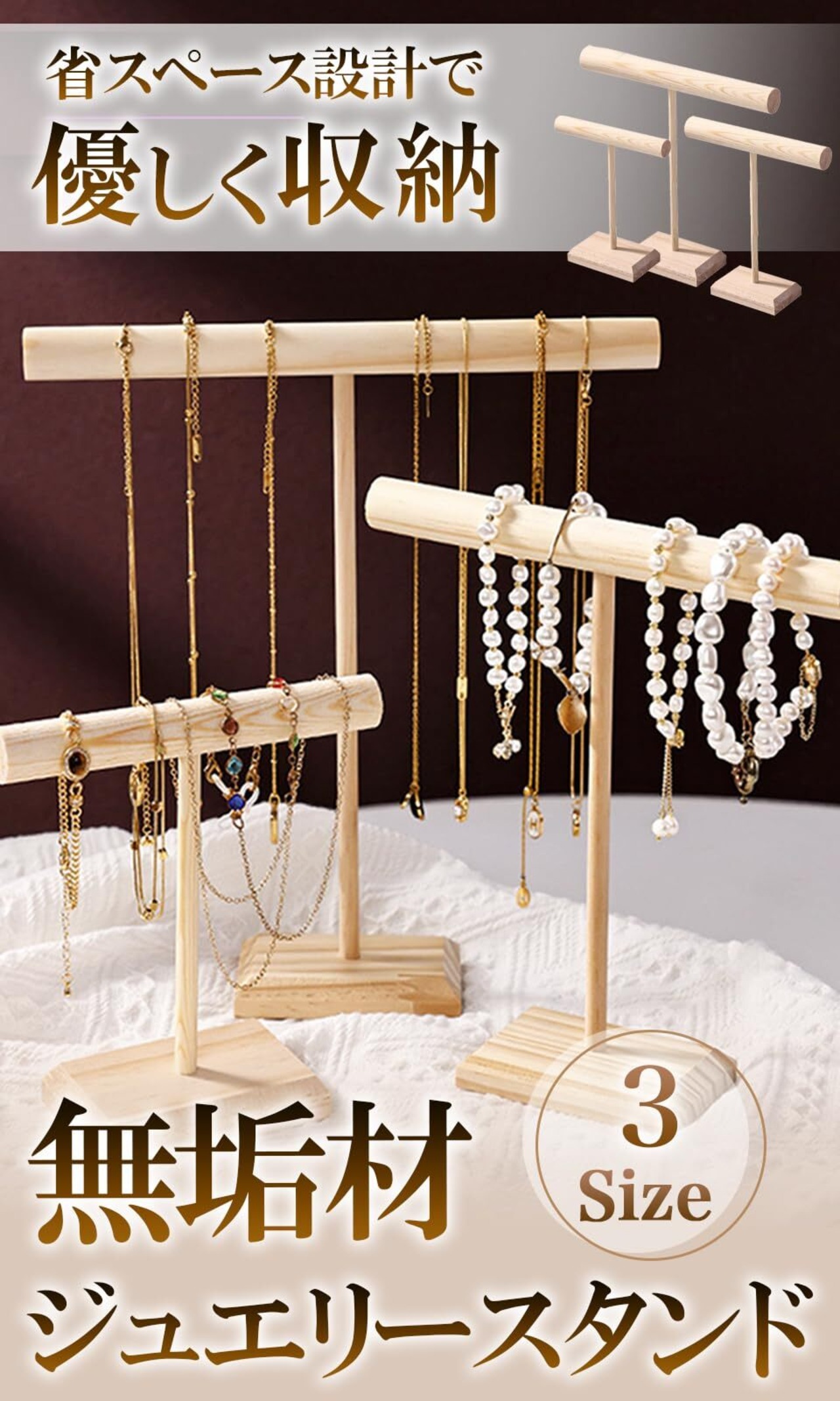 【優しく収納】天然木の温もりが、あなたの大切なアクセサリーを優しく包み込みます。木製だから傷つきやすいアクセサリーも安心して収納できます。ネックレスやブレスレット、シュシュなどの収納にぴったりです。