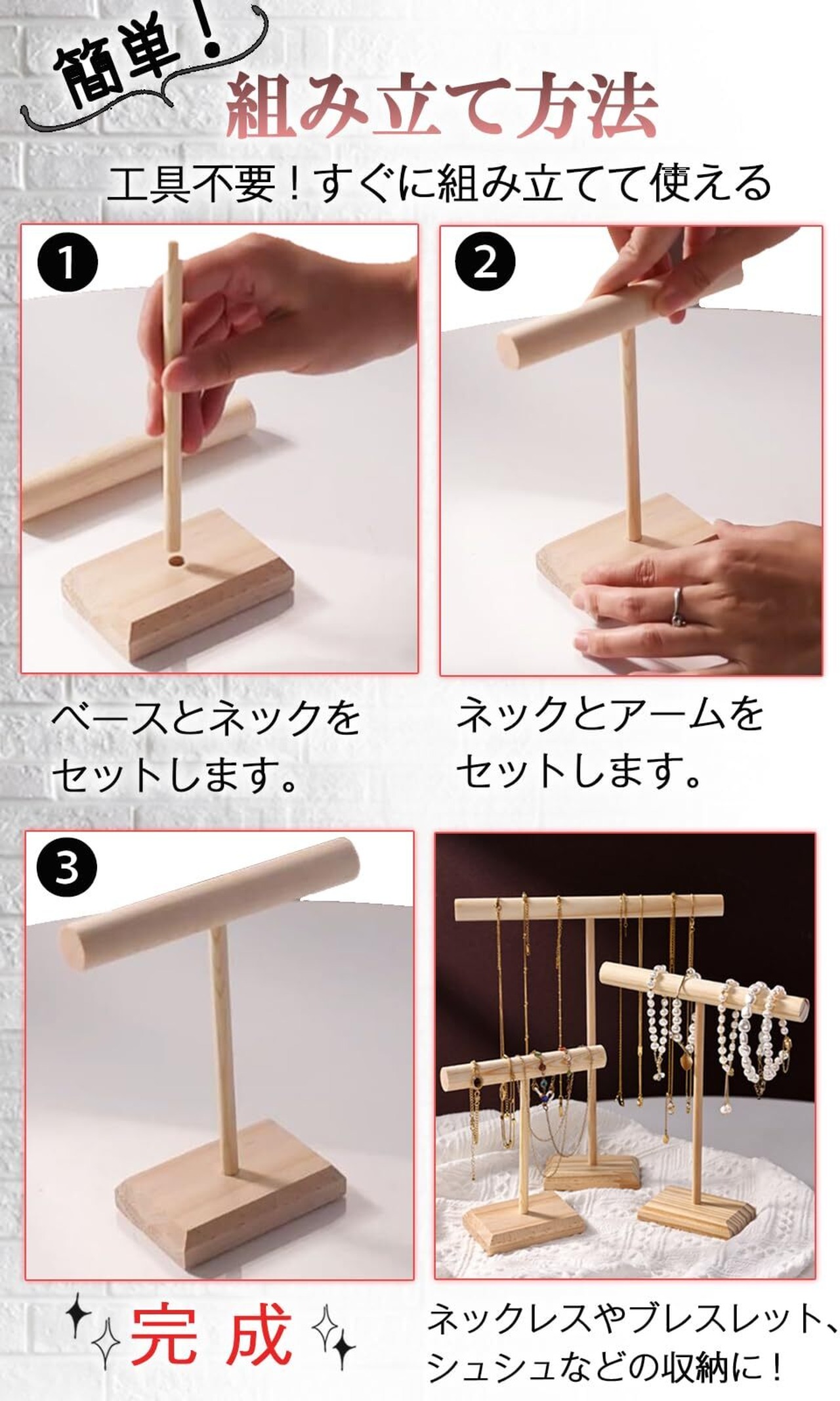 【優しく収納】天然木の温もりが、あなたの大切なアクセサリーを優しく包み込みます。木製だから傷つきやすいアクセサリーも安心して収納できます。ネックレスやブレスレット、シュシュなどの収納にぴったりです。 【シンプルなデザイン】リビングやベッドルームなど、どんなインテリアにも馴染むデザインで、アクセサリーの美しさを引き立てます。シンプルな構造が整理の手軽さと見やすさをもたらし使いやすいです。 【省スペース設計】ベースの設置面積が小さく、デスクやドレッサーの上にも置きやすいサイズ感で収納力が抜群です。また、コンパクトながらを安定感があります。 【簡単組み立て】工具不要で、すぐに組み立てて使えます。 【安心】万が一、初期不良などございましたら、購入から30日間以内であれば返品が可能です。
