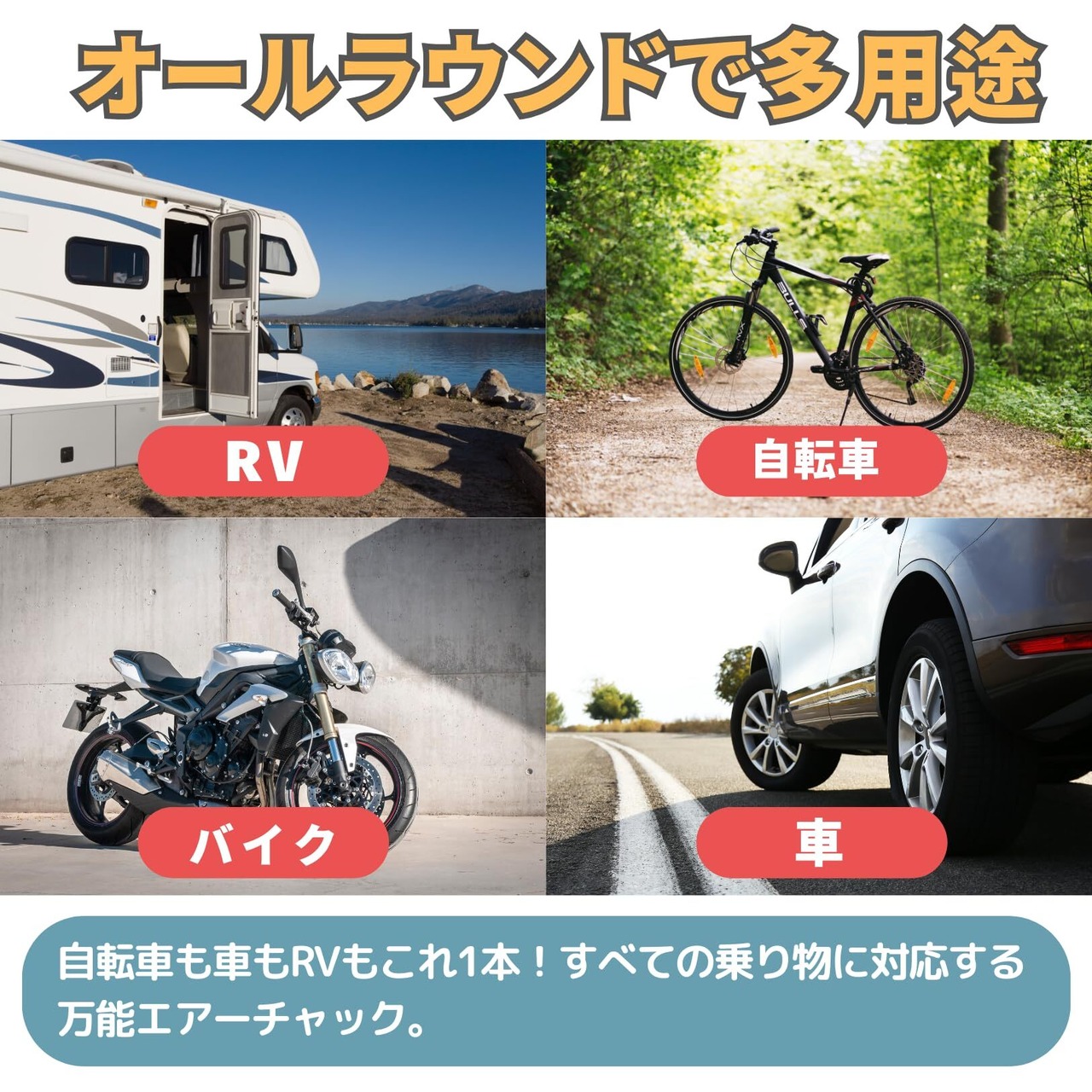 【幅広い用途でマルチに活躍】 自転車、車、SUV、RVなど、さまざまな車両に対応。作業場やアウトドアでも便利に使え、専用のポンプコネクタやアダプターとも簡単に接続可能です。これ一つで全てのタイヤメンテナンスが完了します。