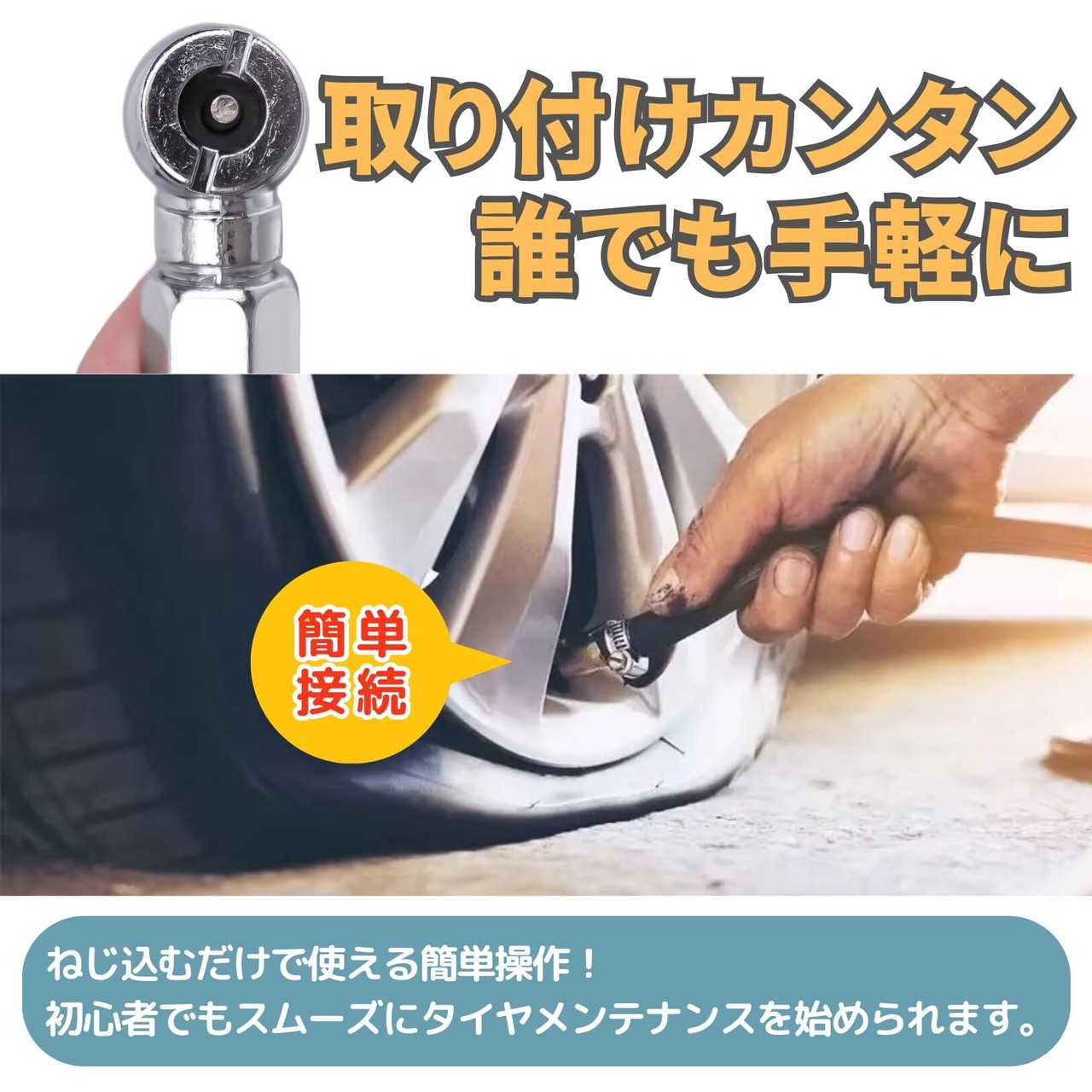 【簡単取り付けで初心者にも安心】 特別な工具や専門的な知識は不要。タイヤバルブに直接ねじ込むだけで、誰でも簡単に取り付けできます。自転車や車など複数の用途に対応し、初心者でもすぐに使用可能な便利な構造です。