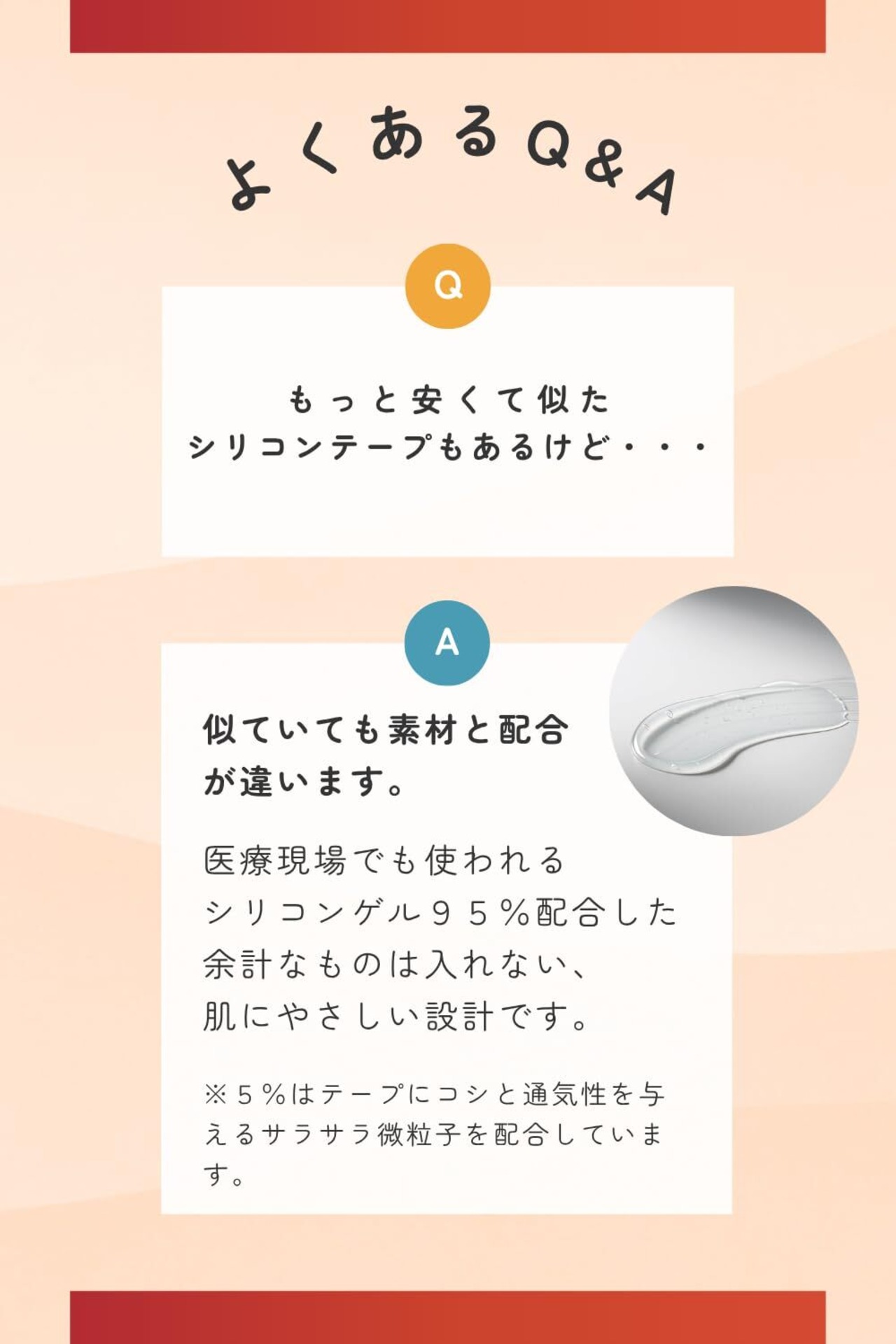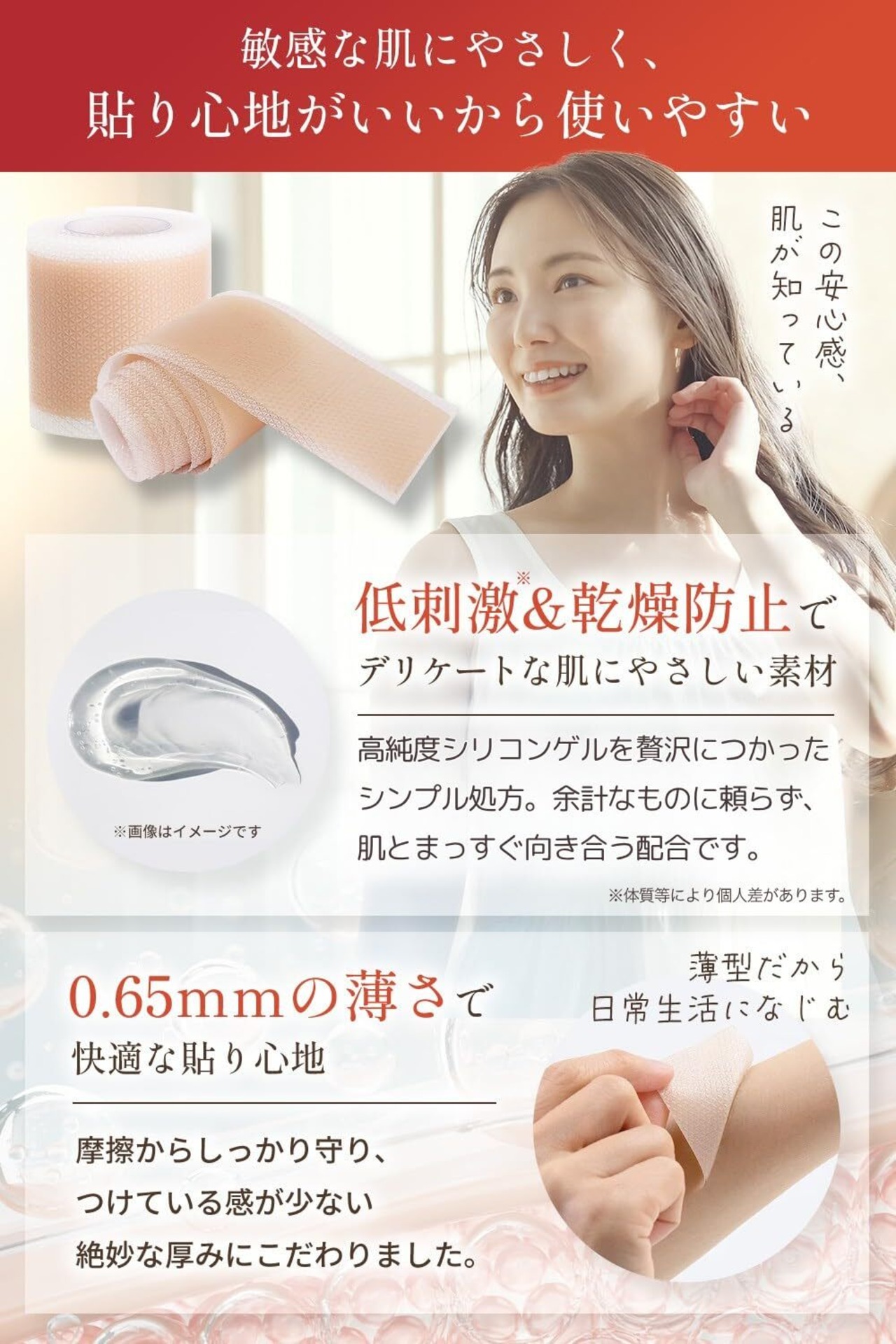 【肌にやさしい使い心地】100%ピュアなシリコンゲルのテープ素材で、余計な成分はゼロ。低刺激設計で、敏感肌やアレルギー体質の方でも安心して使用可能。乾燥を防ぎながら、肌をやさしく守ります。