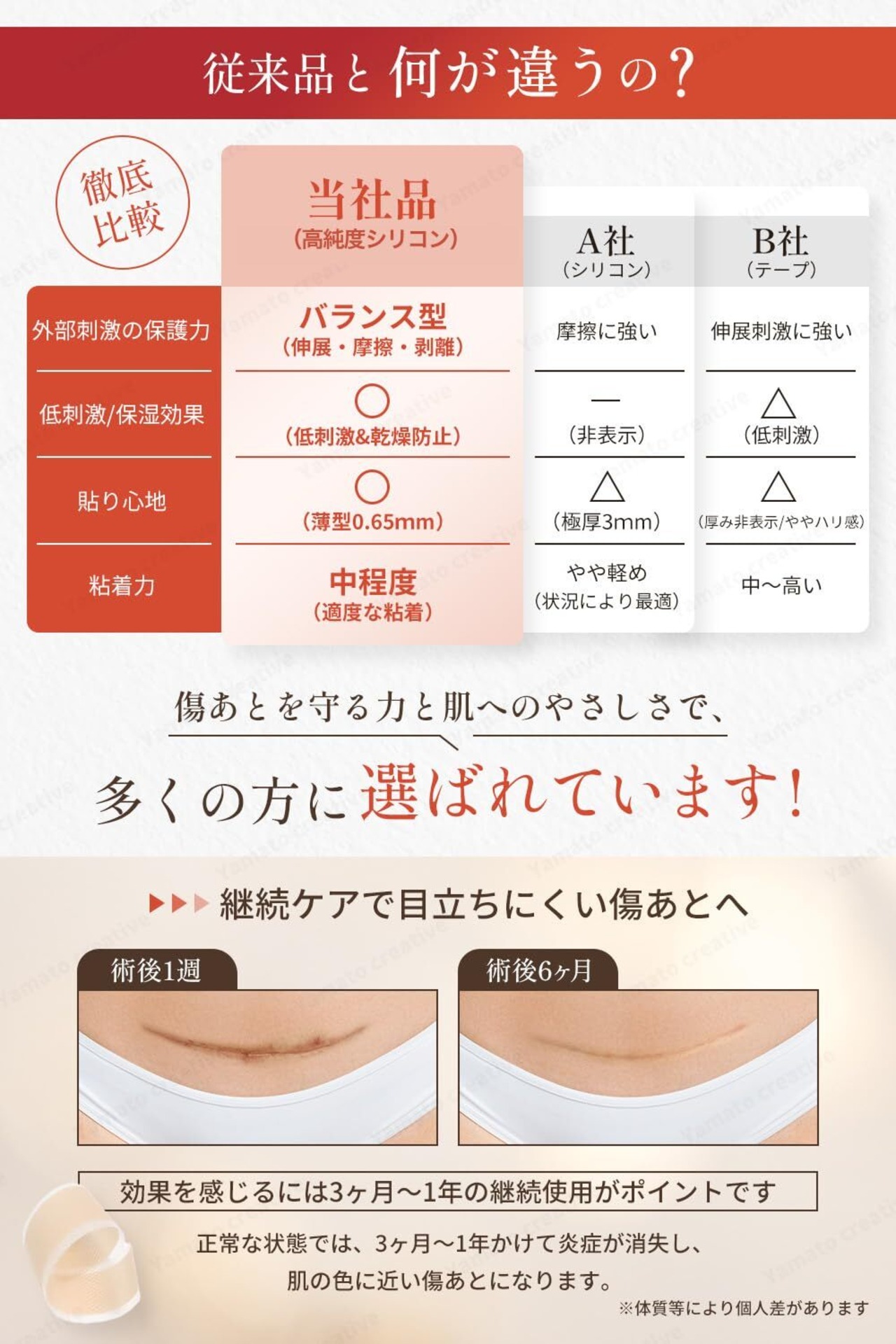 【あなたの肌に寄り添う、やさしいケア】傷あとは外的刺激によって目立ちやすくなり、放置すると肥厚性瘢痕やケロイドの原因になることもあります。当社品は、皮膚科医監修のもと、傷あとを外部刺激から守り、やさしいケアで美しい仕上がりをサポートします。※治癒・止血などの機能を持たず、あくまで外部刺激から保護することを目的としています。