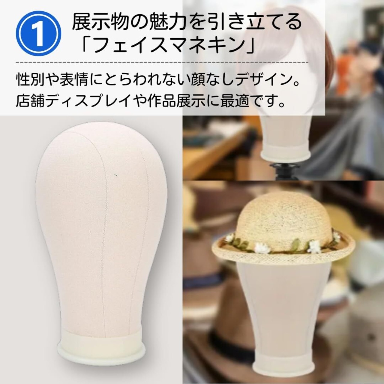【シンプルで使いやすいフェイスマネキン】落ち着いたベージュトーンが、インテリアやディスプレイに自然に調和します。ウィッグや帽子、アクセサリーの展示など多用途に活躍するマネキンです。