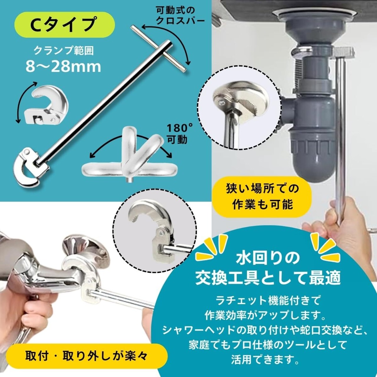 【力をしっかり伝える滑り止めグリップ付き設計】 Cタイプは、握りやすい約30cmの長さを備えたT字型の本体は、作業時に力をしっかり伝える設計です。さらに、可動式クロスバーが左右どちらの方向にも対応し、作業効率を大幅に向上させます。クランプ範囲は8~28㎜と幅広く、水回りの交換工具として最適です。水栓や蛇口の交換作業も簡単にこなせるため、初心者でも安心して使用できます。