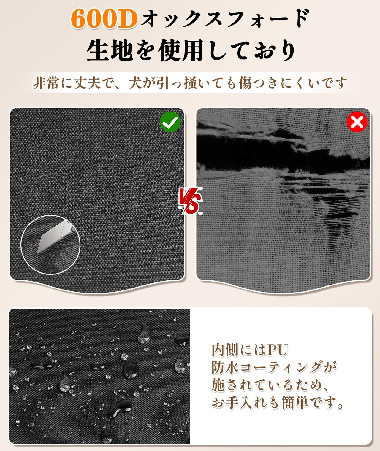 【高耐久600Dオックスフォード布&PU防水加工】 傷つきにくく、お手入れ簡単、600Dオックスフォード布にPU防水加工を施し、汚れや水に強いので、いつでも清潔に保てます。当社の犬 ドライブシートがあれば、アクティブな愛犬にも心配しません。