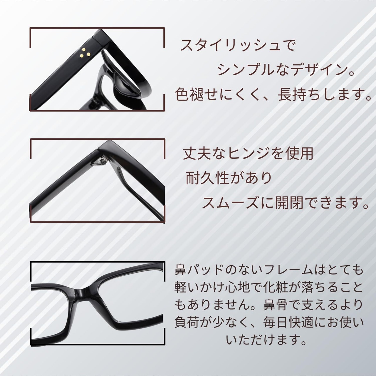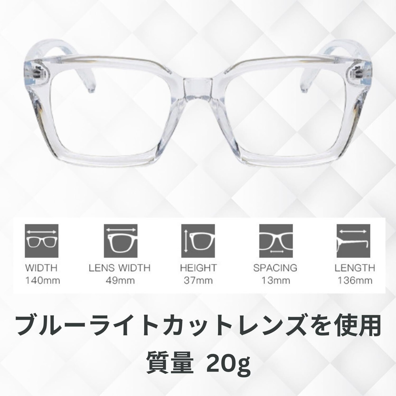 衝撃に強く歪みにくいセルフレーム しっかりとレンズを支えられるフルリム 透明レンズを使用しているため、視界を遮ることなくクリアな視界を提供します。ブルーライトカットレンズなので、オフィスワークやスマホ読書の際にもストレスフリーでお使いいただけます。
