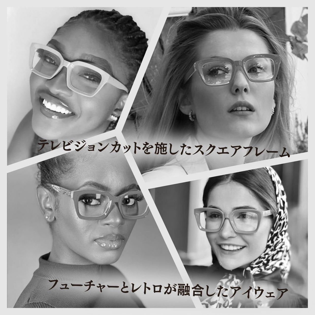 クラシックなスクエアフレームは、流行に左右されずどんな顔型にもマッチし、ファッションのアクセントとしても最適です。太リムのテレビジョンカットが、ビンテージ感を演出してくれ、ビッグサイズのフレームが顔の印象を引き締めてくれます