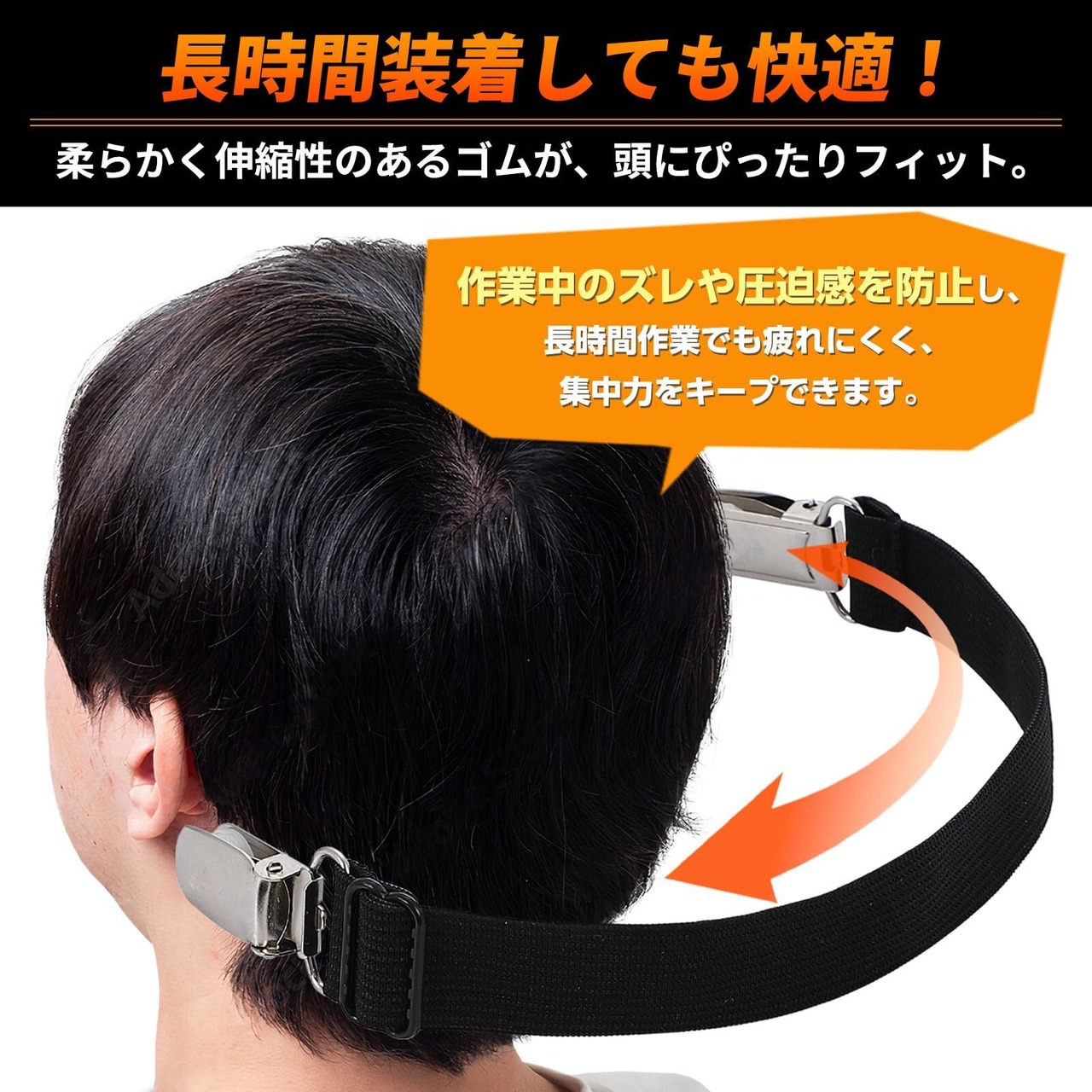 【長時間装着しても快適】 柔らかく伸縮性のあるゴムが、頭にぴったりフィット。作業中のズレや圧迫感を防止し、長時間作業でも疲れにくく、集中力をキープできます。