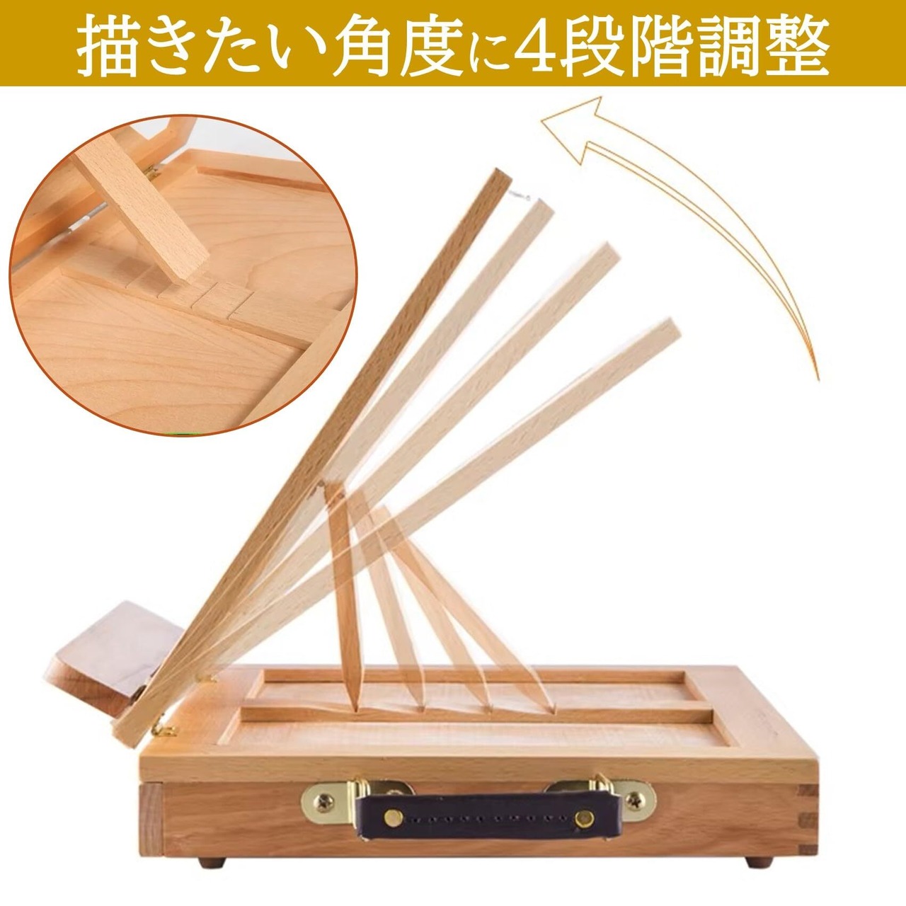 イーゼルの角度は4段階で調整可能です。高さにすると5cm-28cm範囲で調整することができます。絵を描く環境や、お好みで角度を変えることができます。