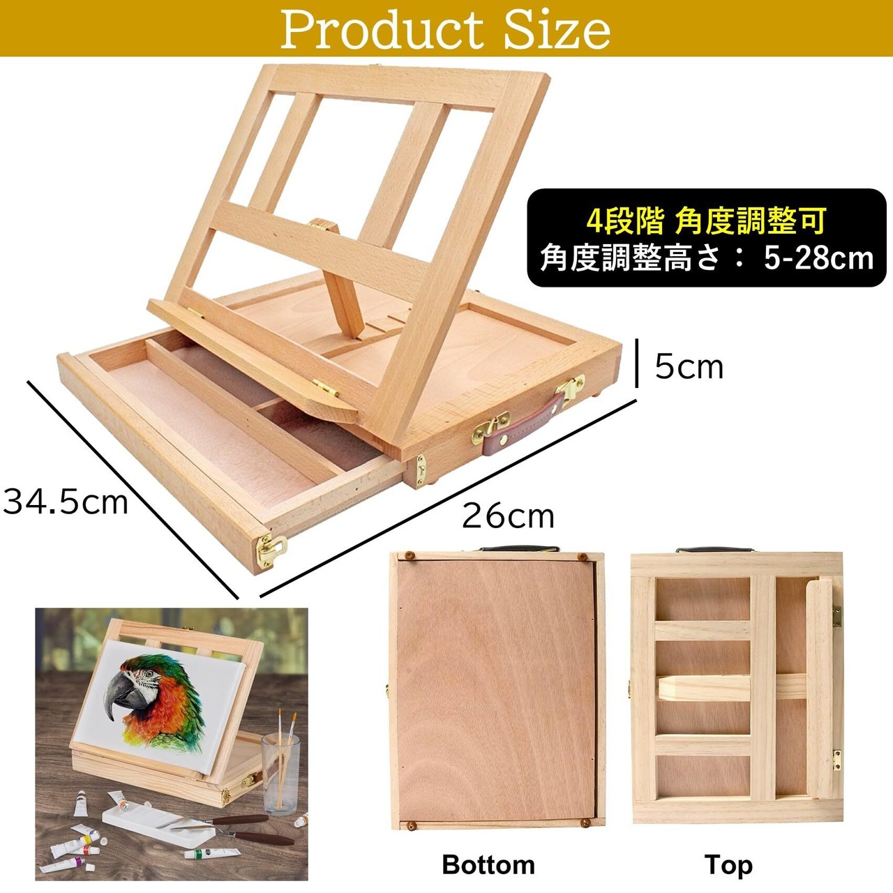 アトリエや屋外で絵を描く際に、筆や絵の具などの画材を引き出しに収納して持ち運べる折りたたみ式木製卓上イーゼルです。持ち手付きですのでカバンの様に持ち運ぶことができます。材質は耐久性に優れたブナ材(ビーチ)製です。ブナ材は家具に良く使用され、長くご愛用いただくことができる木材です。