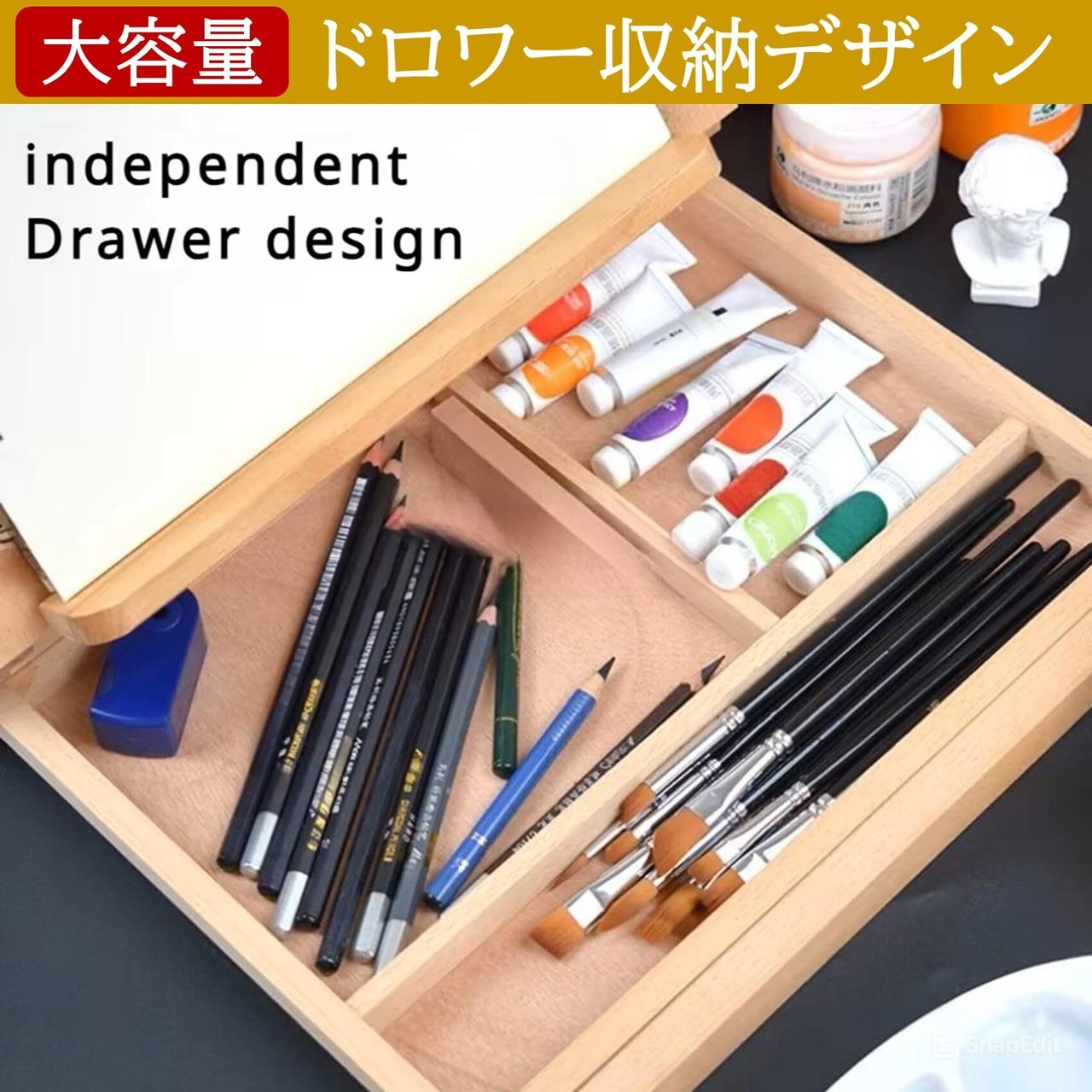折りたたみ式イーゼルは大容量の引き出しを装備しています。引き出しは3区画設計となっており、筆、絵の具、ペインティングナイフ、鉛筆などの画材を収納することができます。イーゼルと画材を一つにまとめることができますので、荷物がかさ張らず大変能率的です。