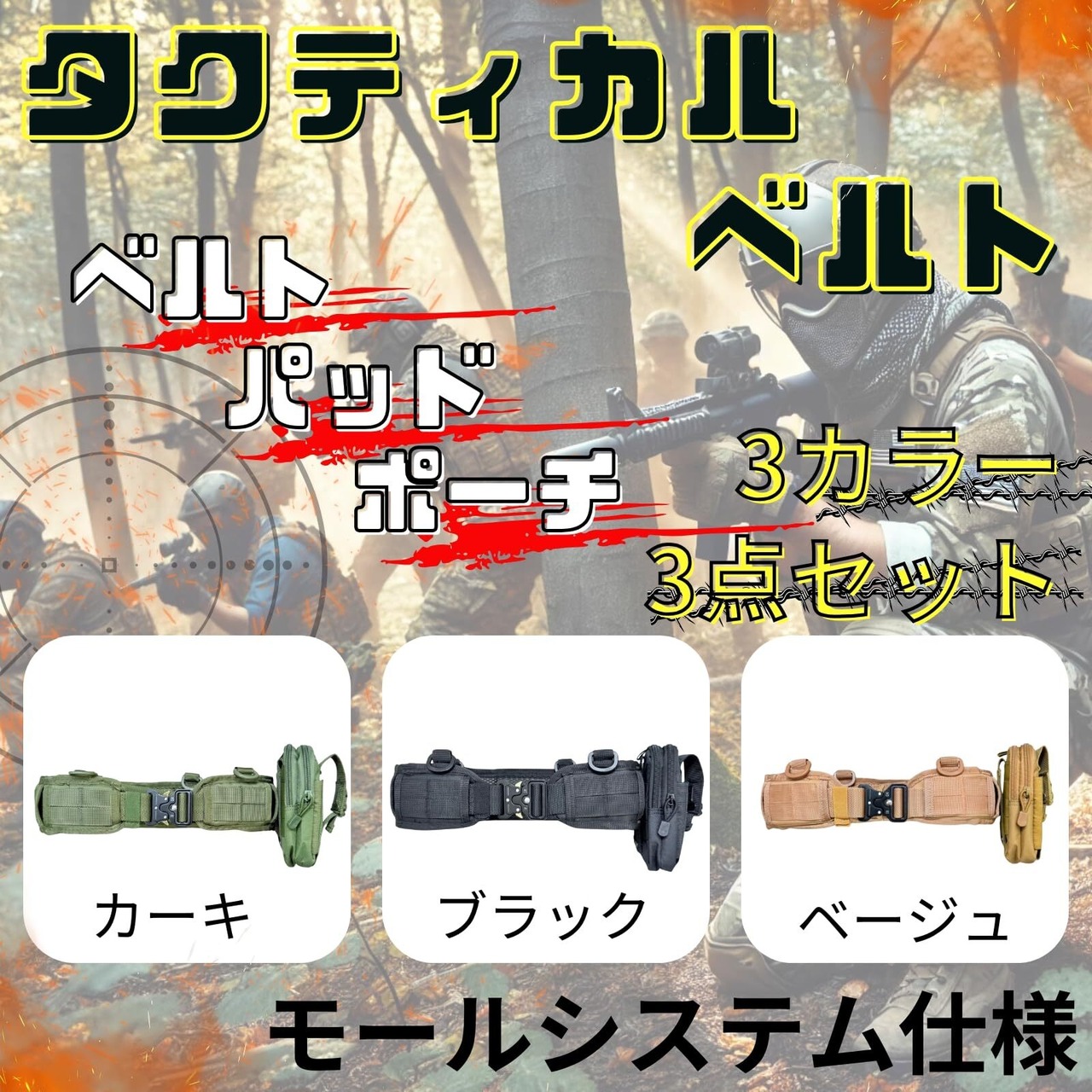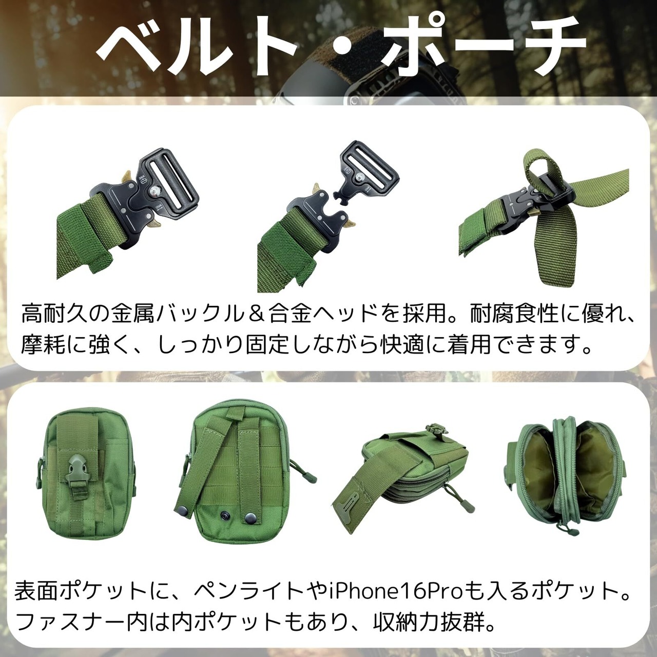 すぐに使える安心の3点セット:タクティカルベルト、MOLLE対応パッド、多機能ポーチの3点セットで、初心者からプロまで幅広く対応。高品質素材と実用性を備えたこのセットは、あらゆるシーンで信頼できるパートナーになります。買ったその日からフル装備でアクティビティをお楽しみいただけます。