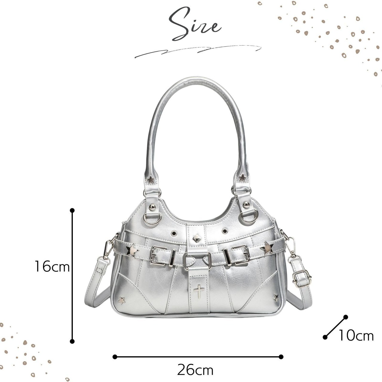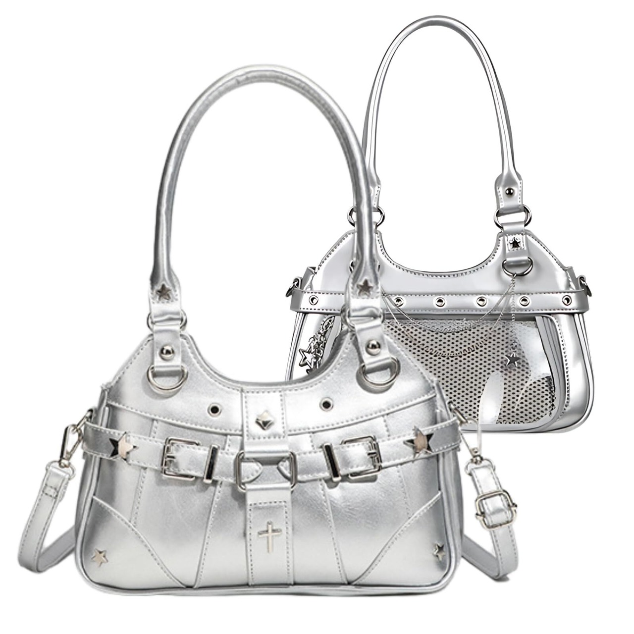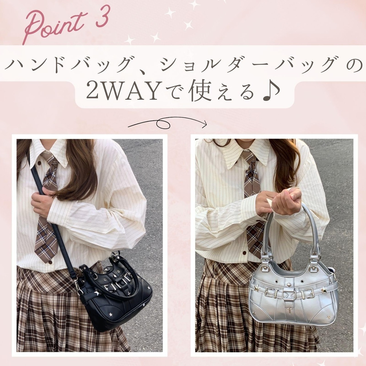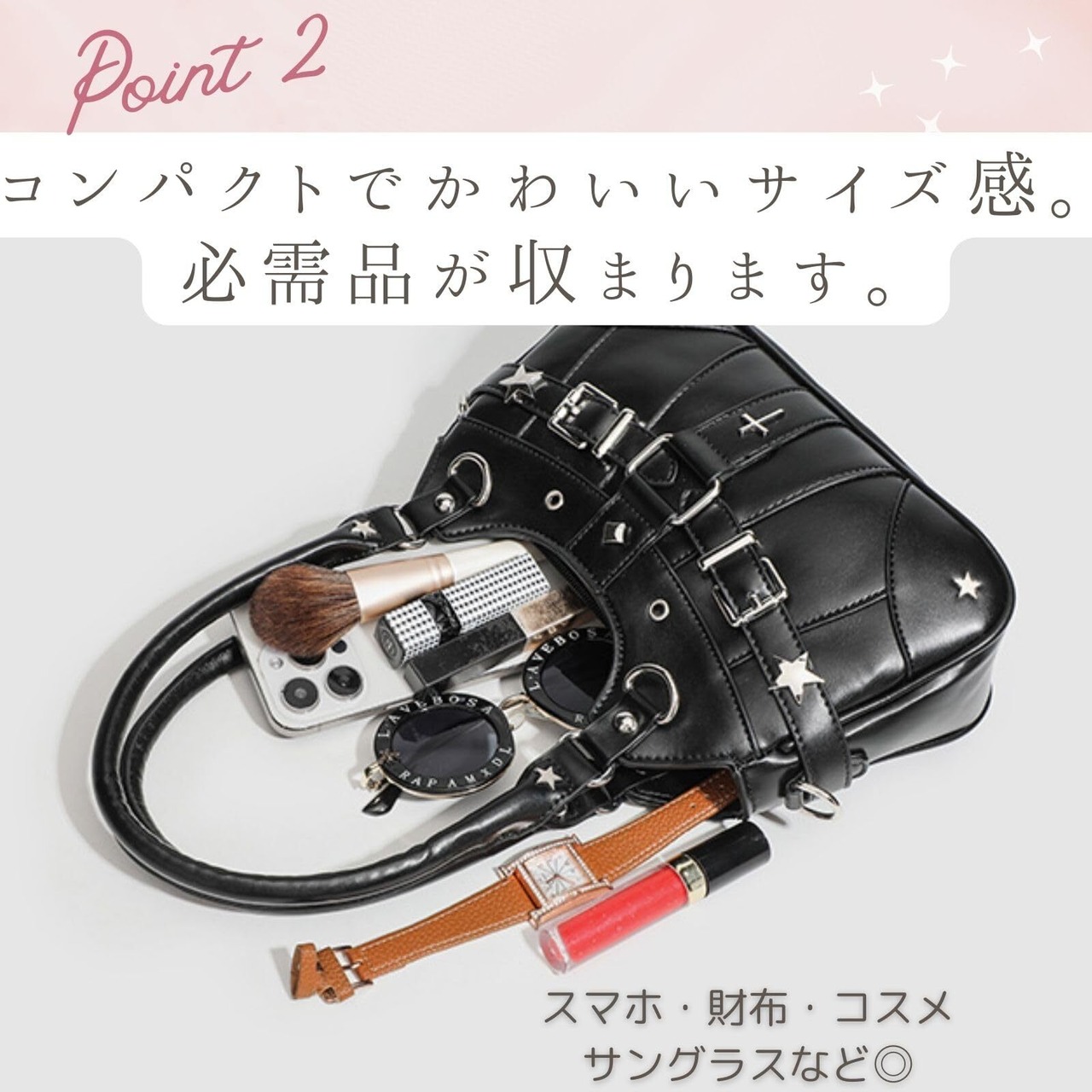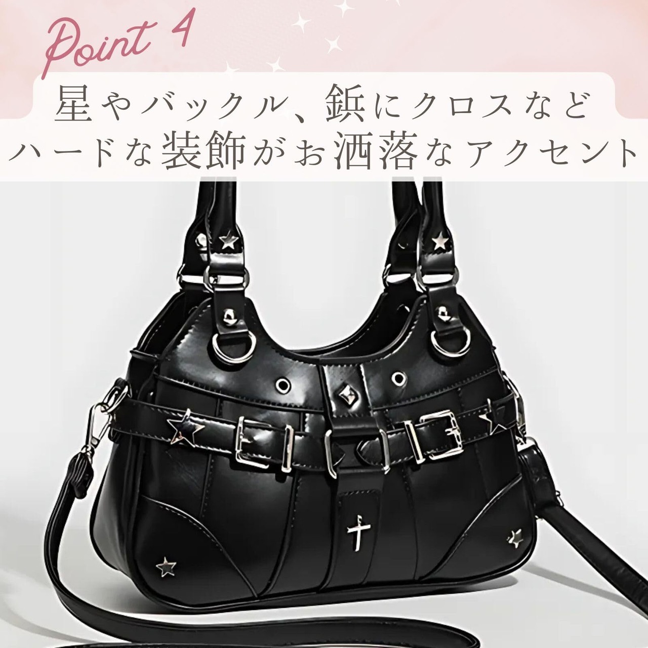 星やバックル、鋲にクロスなどハードな装飾がお洒落なアクセント。 トート・ショルダーの2WAYで利用できて使い勝手も抜群です◎ 肩紐は着脱可能です。