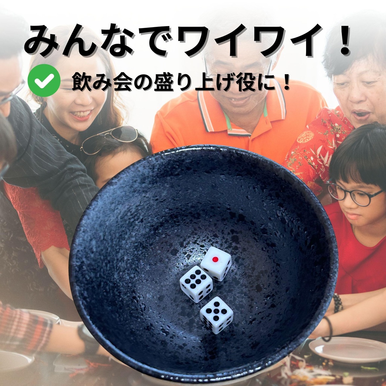 (カジノ気分を楽しもう)常勝チンチロセットで、家族や友人との時間をもっと楽しく!セットには、どんぶり1個、通常賽3個、そしてゲームルールを解説した説明書が付いています。カジノのような雰囲気をお手軽に楽しめるこのセットは、パーティーや飲み会で大活躍。