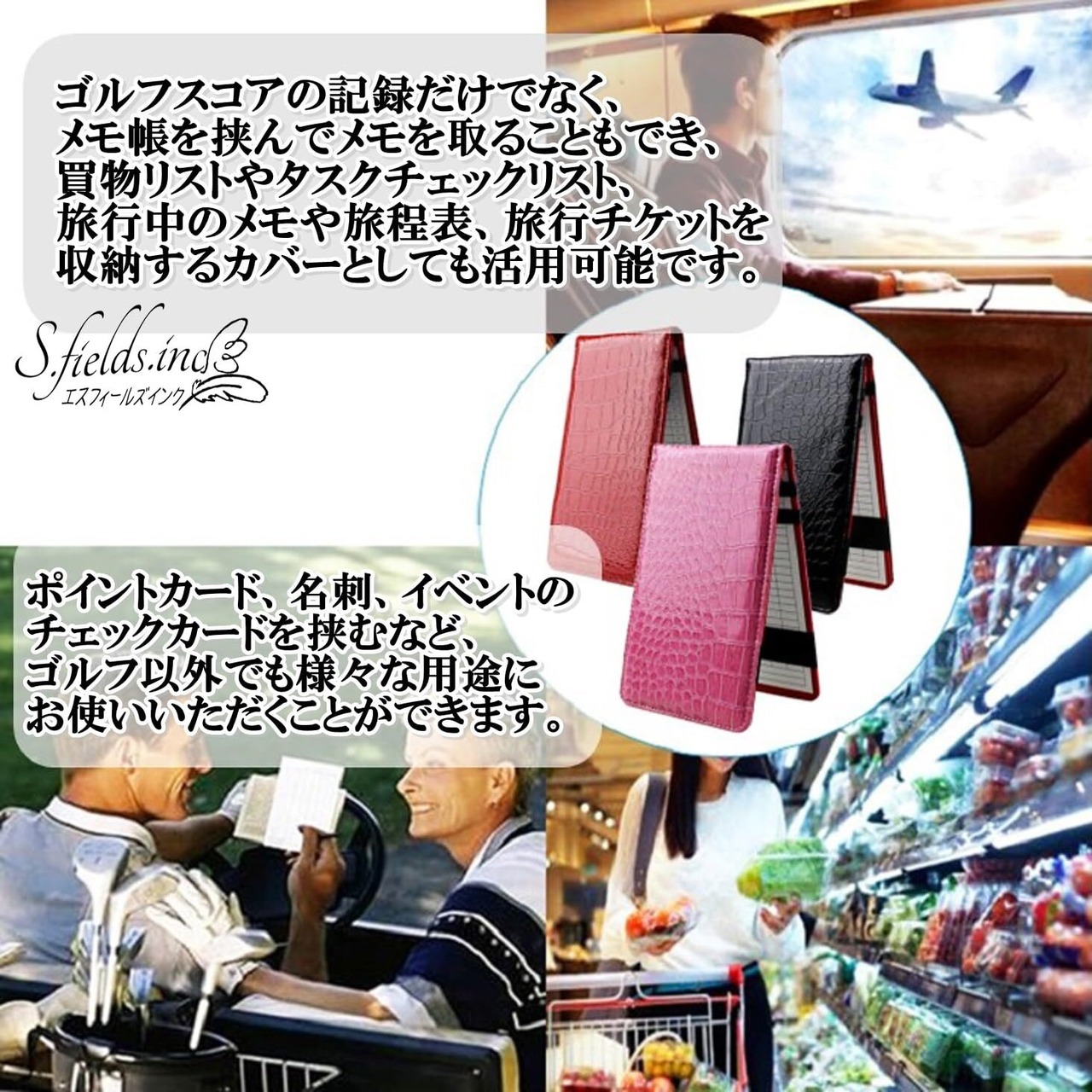 ゴルフスコアの記録だけでなく、メモ帳を挟んでメモを取ることもでき、買い物リストやチェックリスト、旅行中のメモや旅程表、旅行チケットを収納するカバーとしても活用可能です。また、ポイントカード、名刺、イベント用のチェックカードを挟むなど、ゴルフ以外でも様々な用途にお使いいただくことができます。