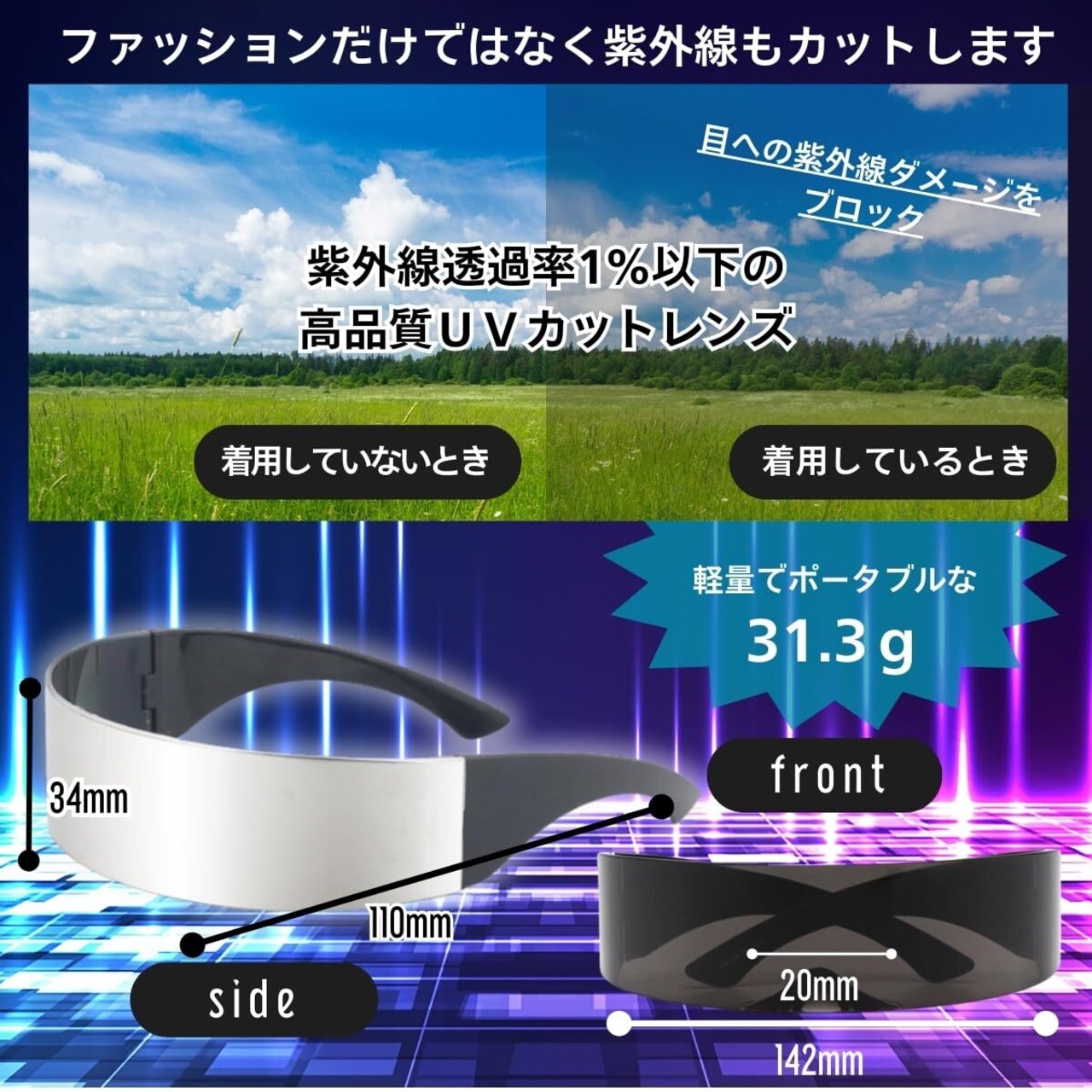 【シールド型デザインでインパクト抜群】 宇宙を連想させる近未来的なシールド型レンズが、圧倒的な存在感を演出。無駄を省いたスタイリッシュなフォルムで、サイバーパンクやSFの世界観をリアルに再現します。さらに、紫外線透過率1%以下の高品質UVカットレンズを採用し、見た目だけでなく機能性にも優れています。屋外イベントやフェス、コスプレ撮影などで活躍するのはもちろん、日常のファッションアイテムとしても◎。