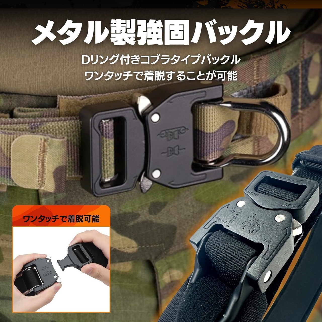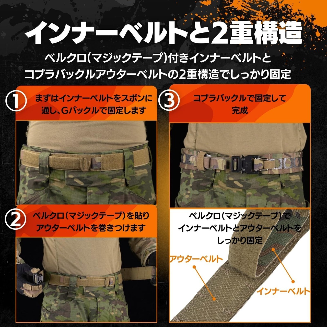 コブラタイプバックルと強化ナイロンを組み合わせたサバゲー用タクティカルベルト。ブラック、コヨーテブラウン、レンジャーグリーン、迷彩、ブラック迷彩の5色から選べます。
