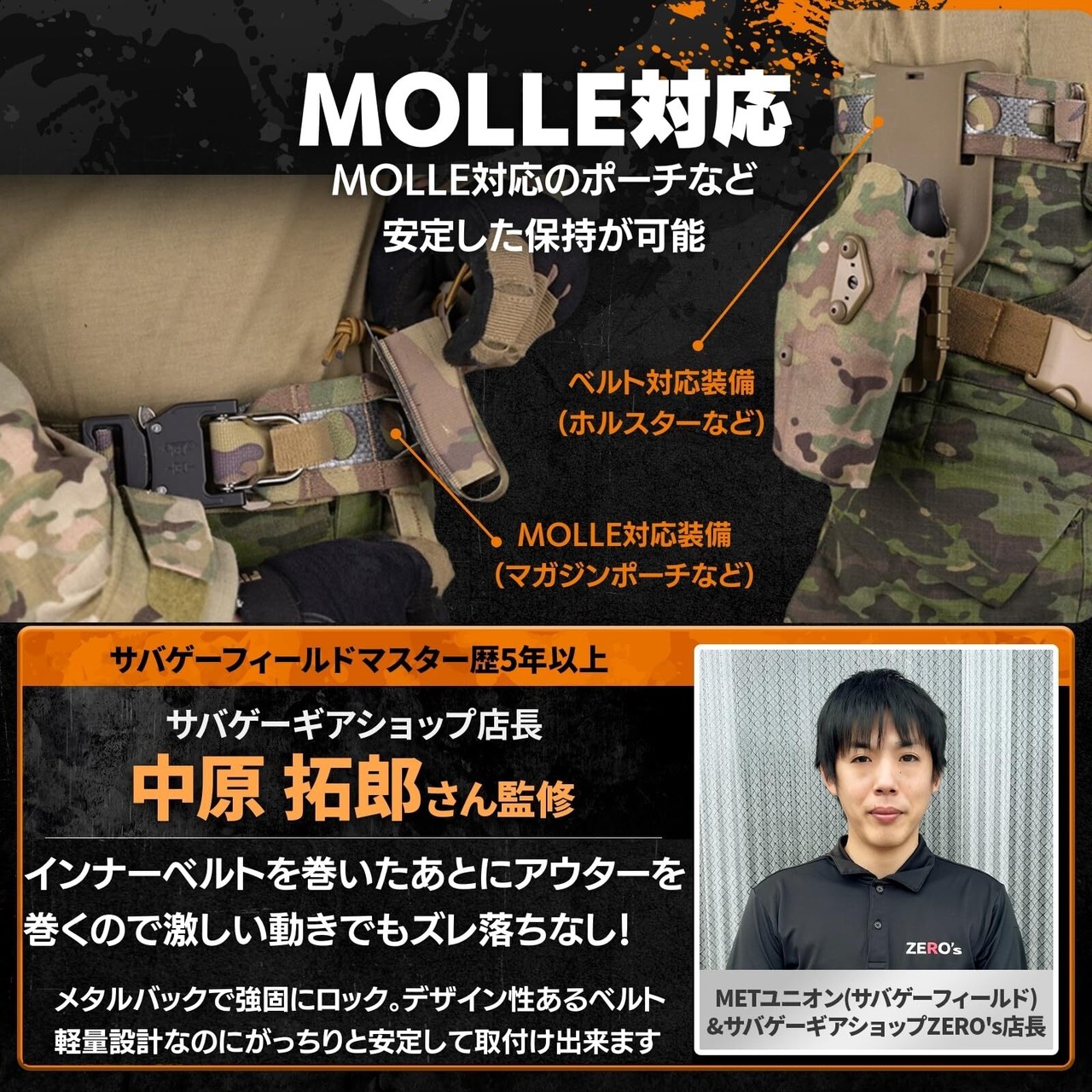 ダンプポーチ、ホルスター、マガジンポーチなど様々なサバゲーアイテムに対応できる拡張性。ベルトサイズはもちろんMOLLE(モール)ベルトサイズ対応の装備品も取付け可能