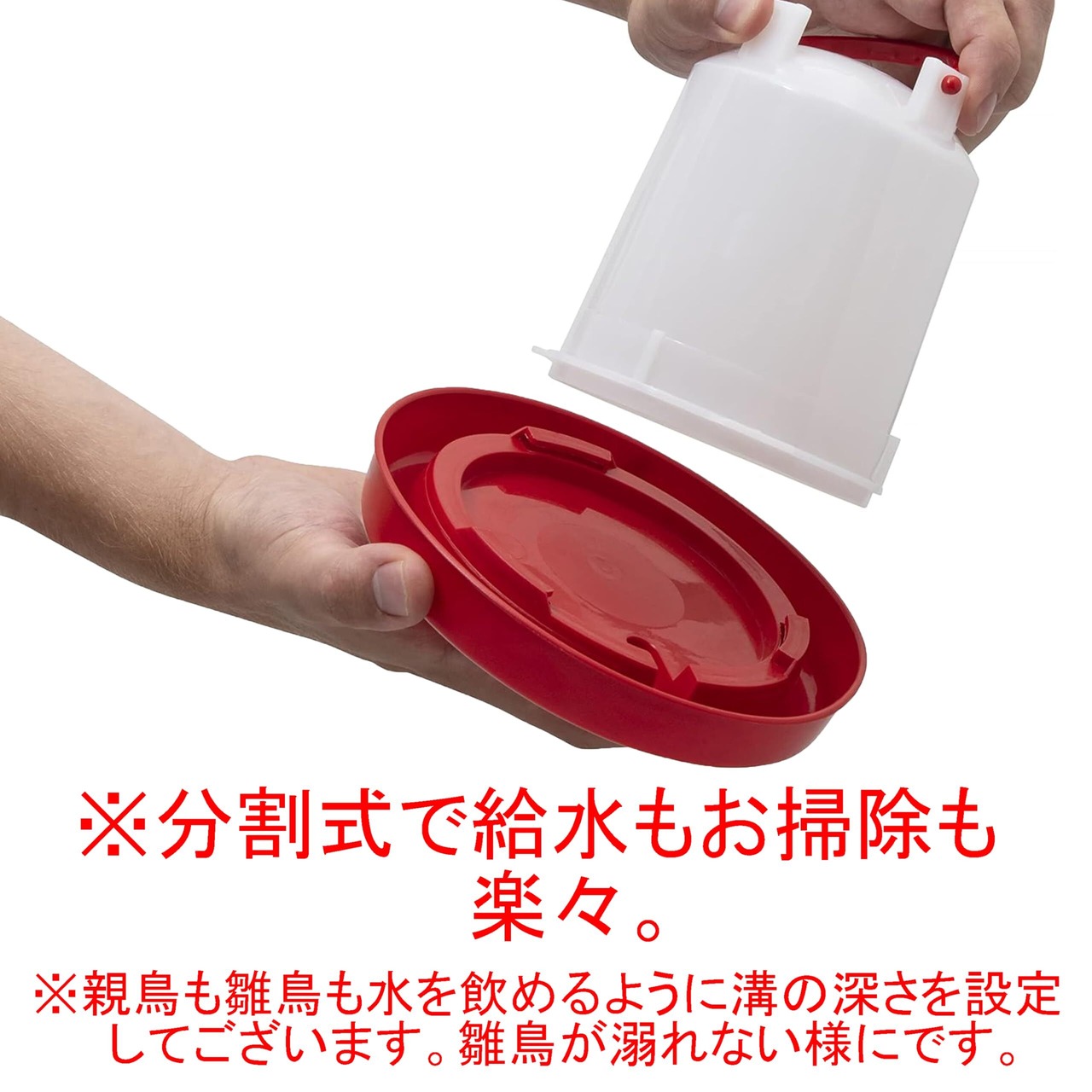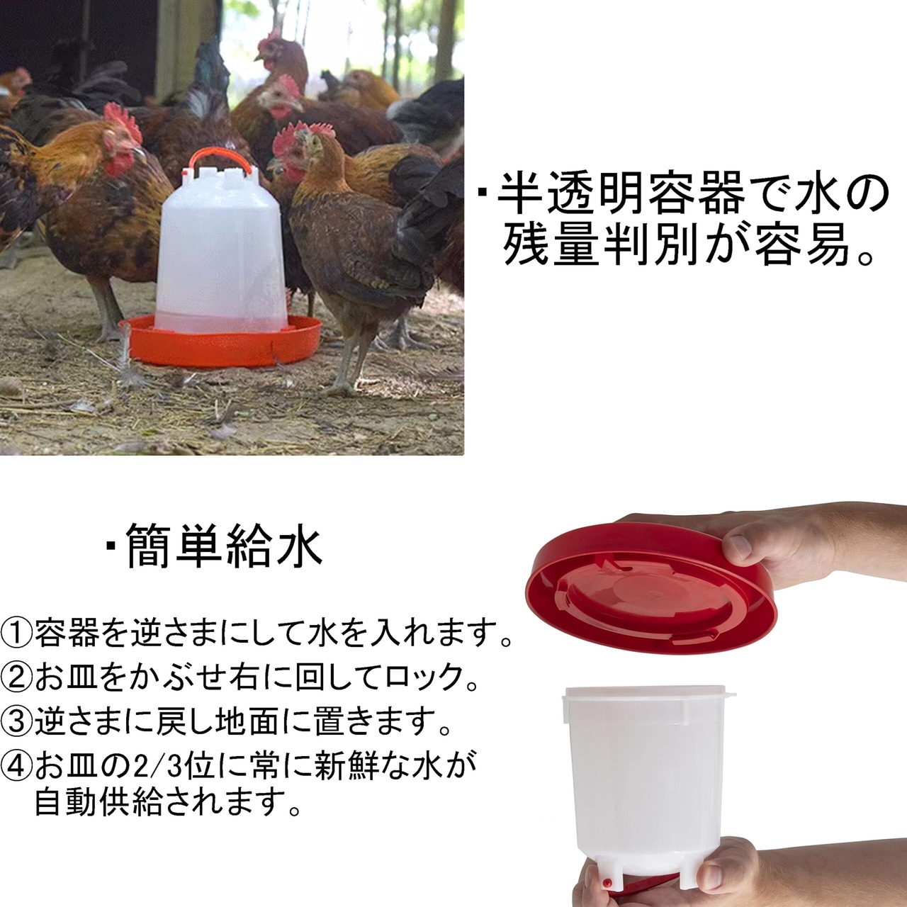 1.容器を逆さまにして水を入れ 2.お皿をかぶせ時計回りに回してロック 3.逆さまにして地面に置きます。 4.お皿の2/3位に常に新鮮な水が自動供給されます。