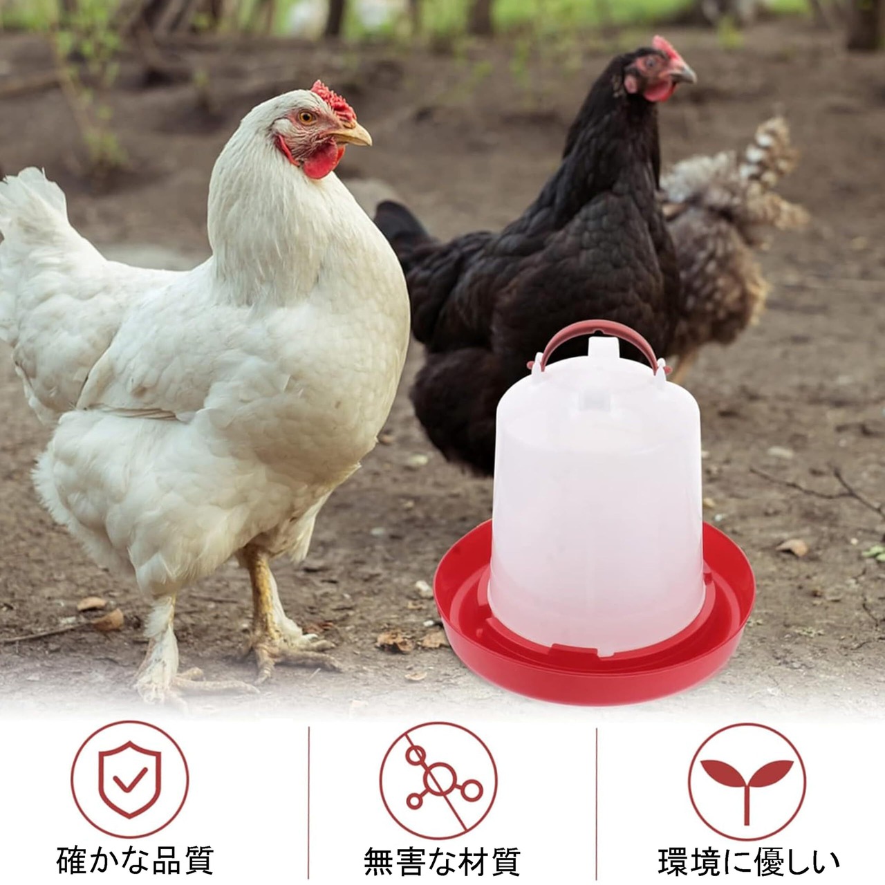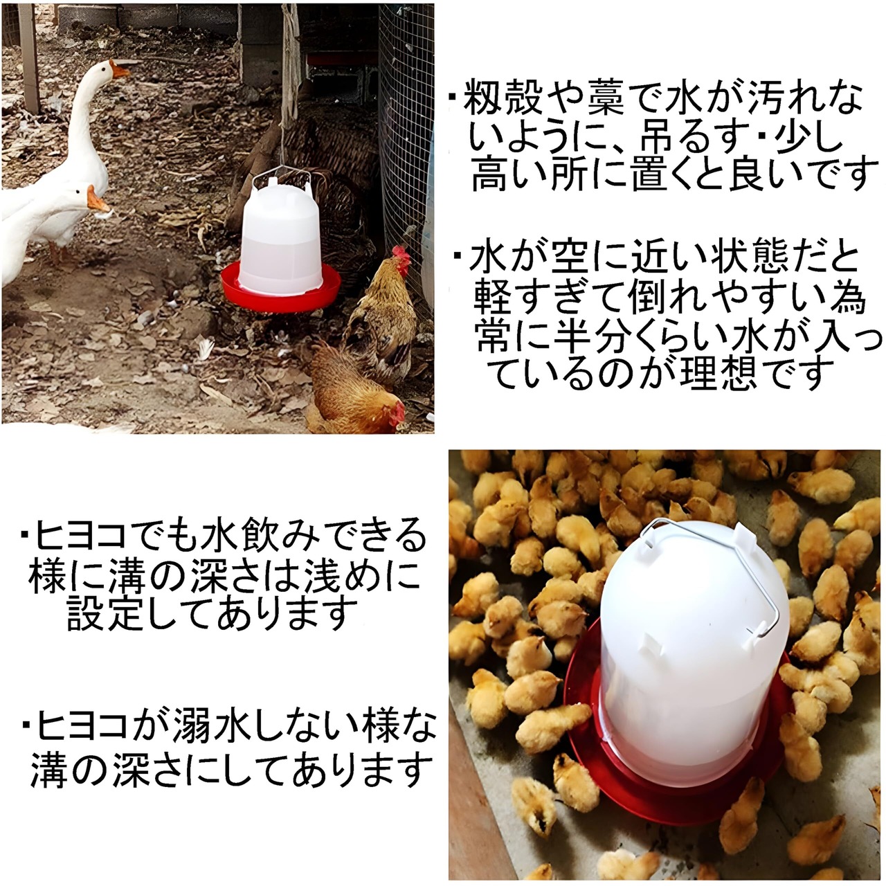 ニワトリやヒヨコ・鳥類の為の自動水やり器です。減った水の量だけ自動で水が給水され常にお皿の2/3位を水で満たしてくれます。ドーム型容器内に入った常に新鮮な水が自動で給水されます。