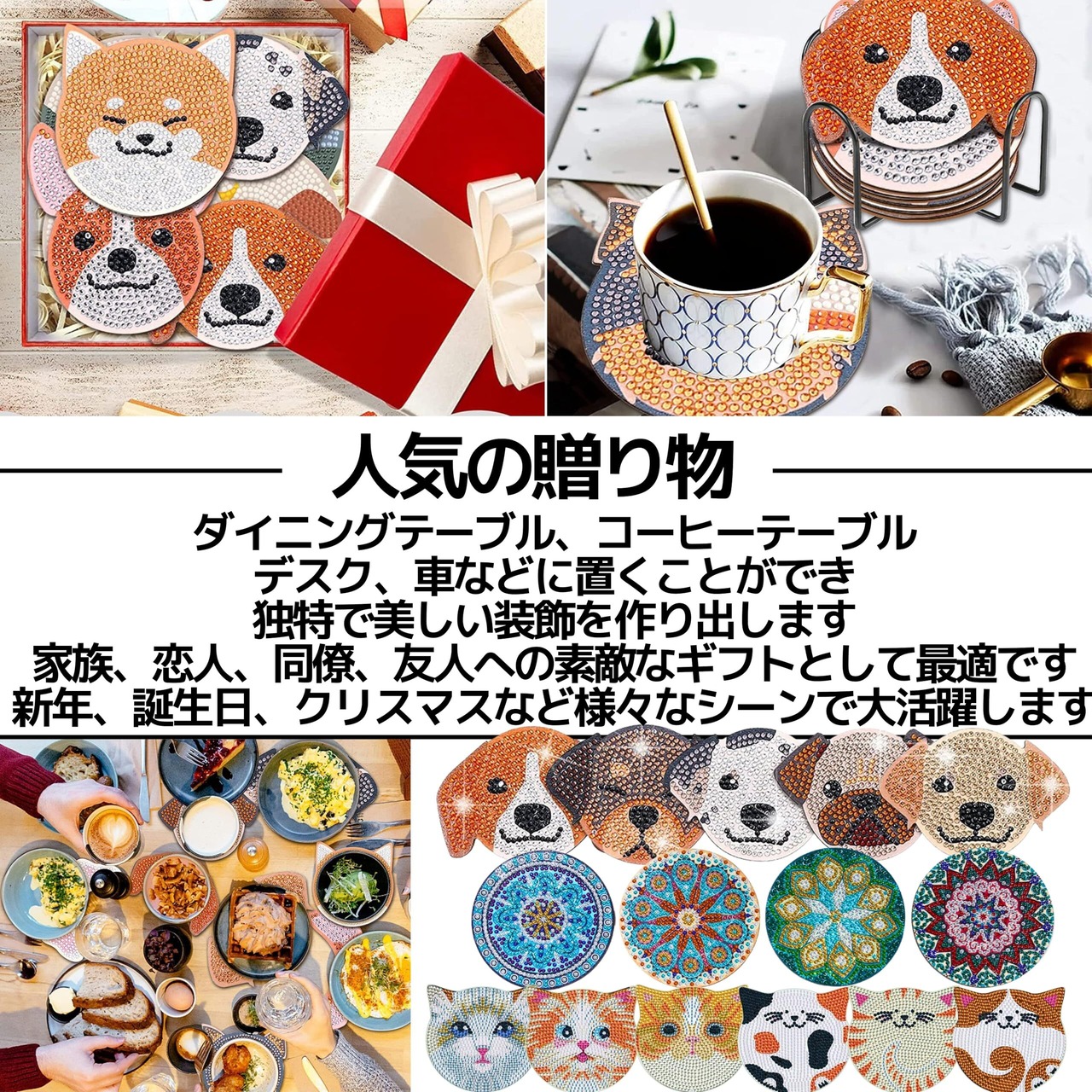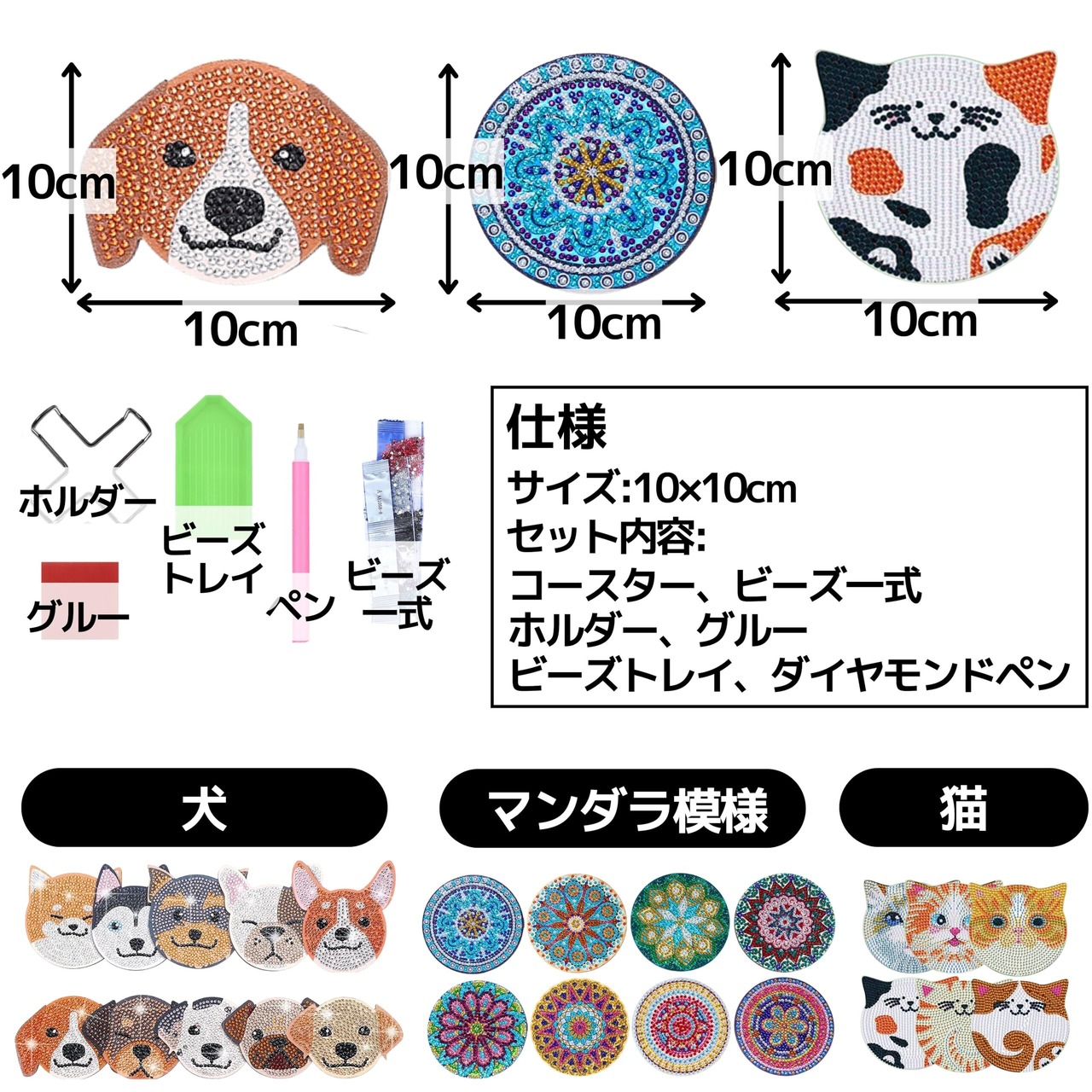 【仕様】 犬、モザイク:セット内容:コースター×10、ダイヤモンド、ホルダー×1、グルー×1、 ビーズトレイ×1、 ダイヤモンドペン×1 猫:セット内容:コースターX6、ダイヤモンド、ホルダーX1、グルーX1、 ビーズトレイX1、 ダイヤモンドペンX1