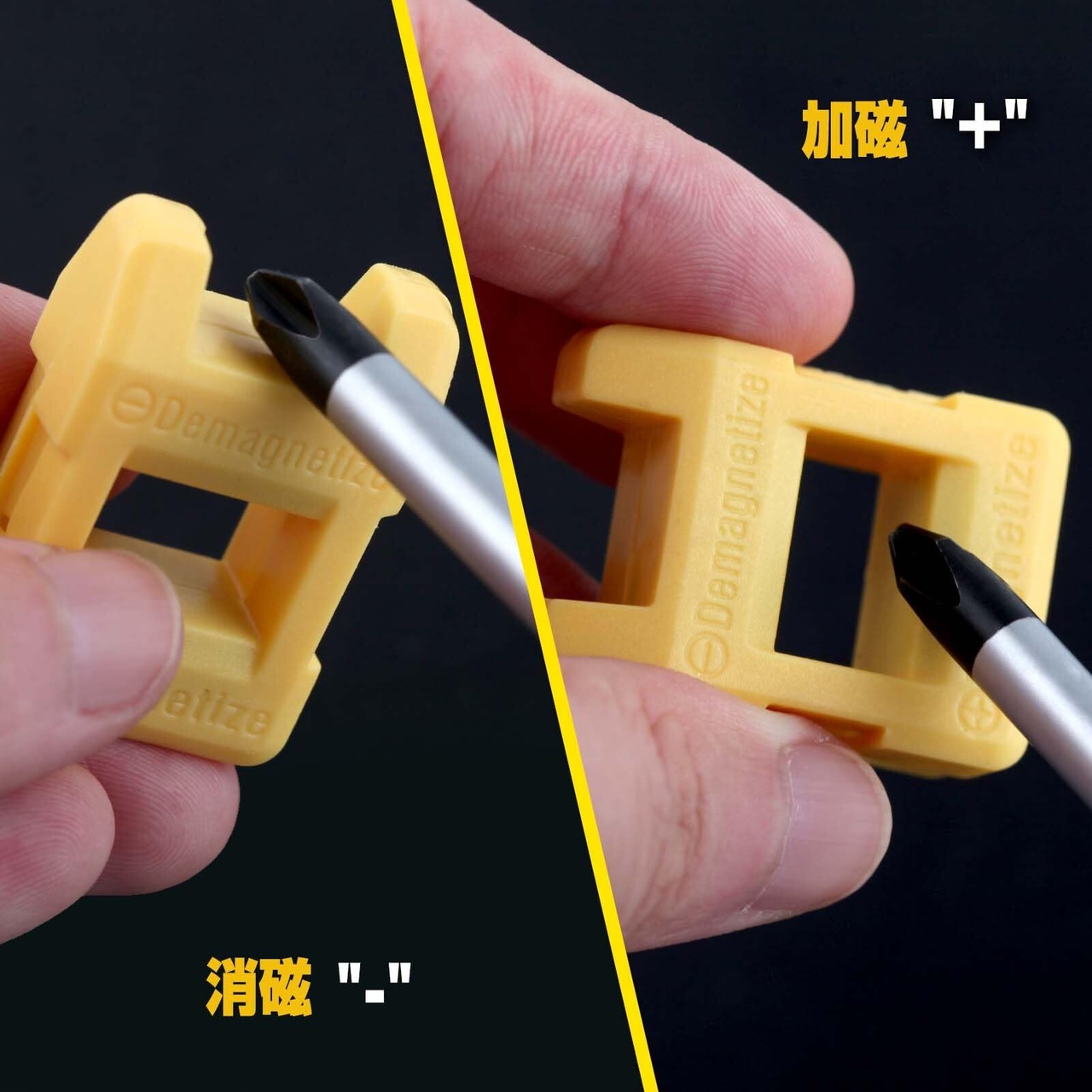 マグネタイザーデマグネタイザー:ツールを磁化するには、ツールを中央の穴に通すだけです。ツールを消磁するには、ツールをサイドスロットにスライドさせます