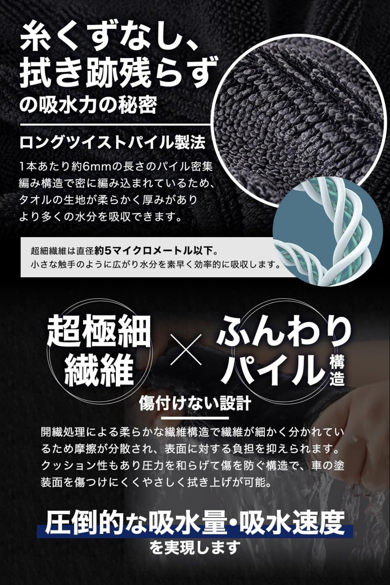 【仕様】サイズ50x80cm/1枚です。ロングツイストマイクロファイバーを使用しており、細かい繊維が水分をスムーズに吸収します。ボディーやガラスにタオルを乗せて引っ張るだけでだけで、驚くほどに表面の水分を一瞬に拭き取り、素早く乾かすことができます。また両面マイクロファイバーなのでひっくり返して拭くことが可能です。