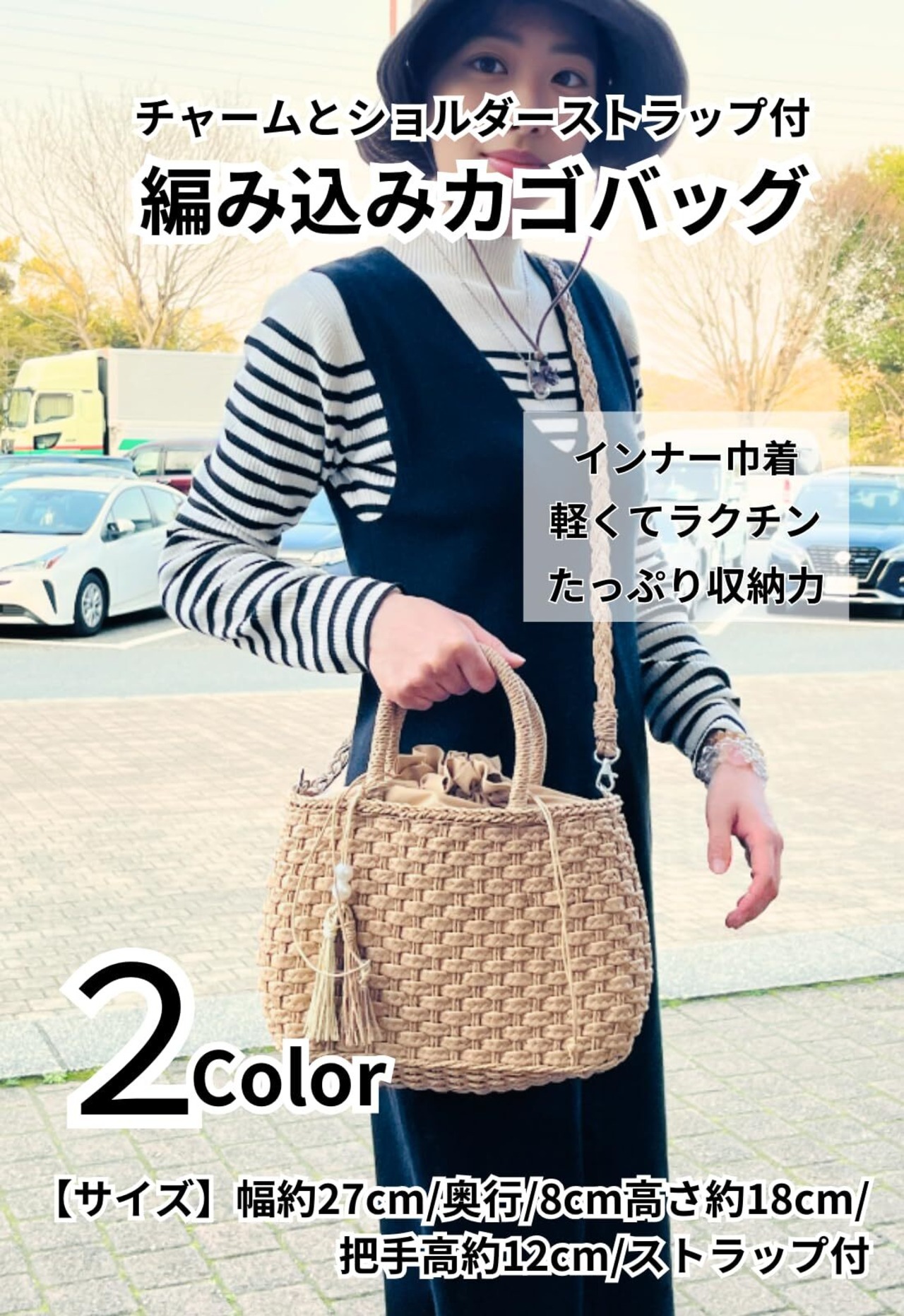 【サイズ】幅約27cm/奥行/8cm高さ約18cm/把手高約12cm/ストラップ付